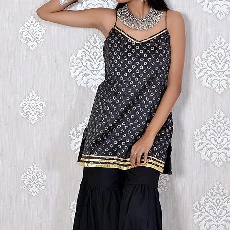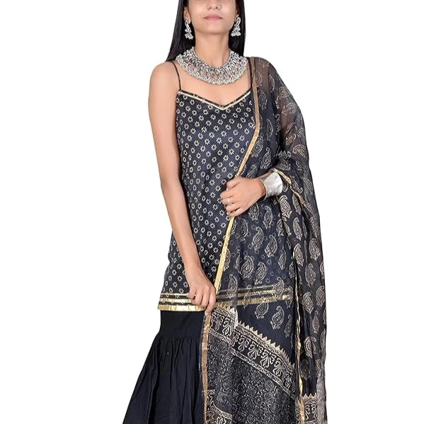 Complete set: fully stitched kurta/top, sharara bottoms, and a matching dupatta for a coordinated ethnic look.