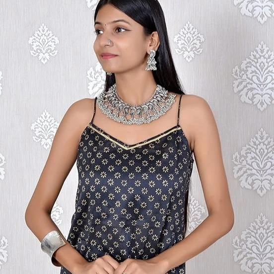 Finely finished detailing including hand‑block print work and gota lace embellishments.