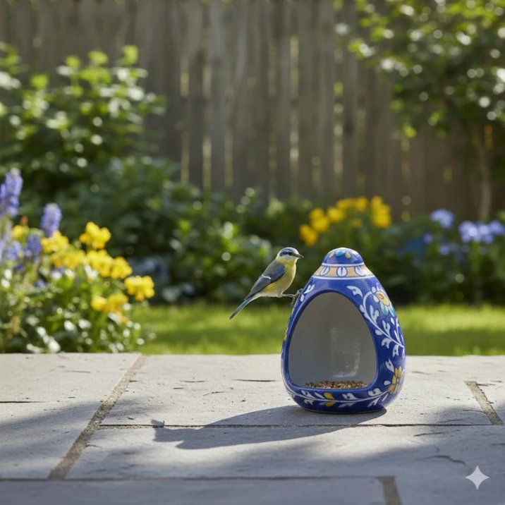 Elevate your garden or balcony with a touch of royal heritage. This exquisite bird feeder is more than just a functional outdoor accessory; it is a piece of living history. Handcrafted by master artisans, it showcases the world-renowned Jaipur Blue Pottery technique a stunning Turko-Persian craft that has been perfected over centuries in the Pink City of India.