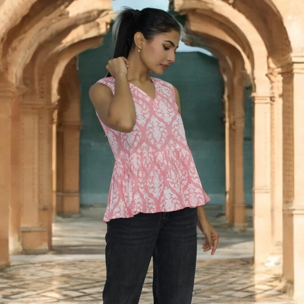 A soothing blush-pink base accented with white floral prints; classic V-neckline with a modern peplum flare.