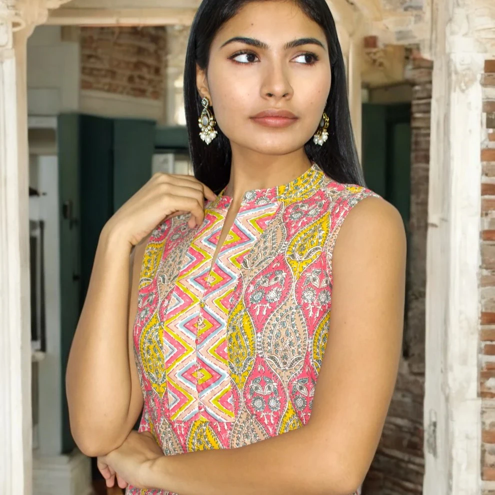 Sleeveless kurta/top featuring floral block-prints & peacock motif details.