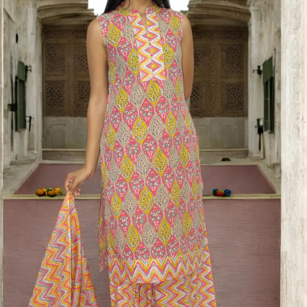 Includes matching bottoms (palazzo or wide-leg) and coordinating dupatta.