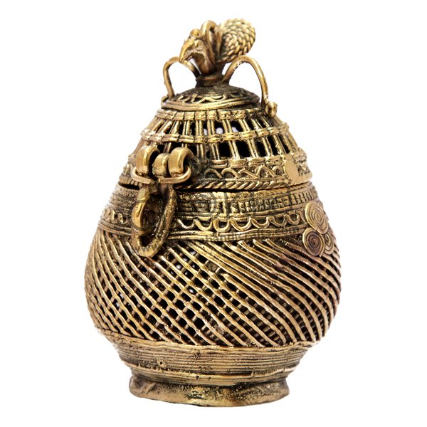 Add a touch of tradition and artistry to your collection with this uniquely handcrafted coconut-shaped Dhokra coin box. Designed using the ancient lost-wax casting technique, this piece is both decorative and functional, making it a perfect keepsake or an impressive gift.