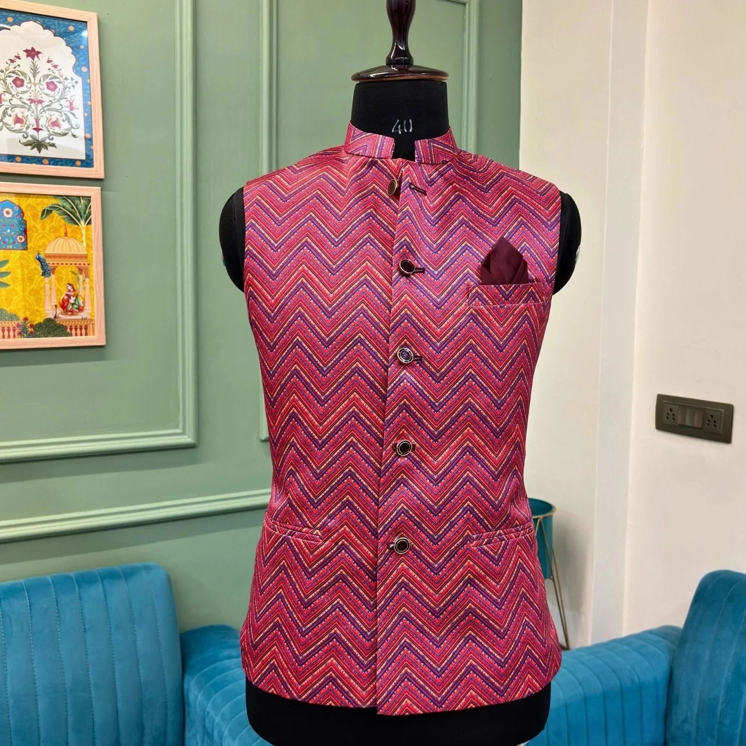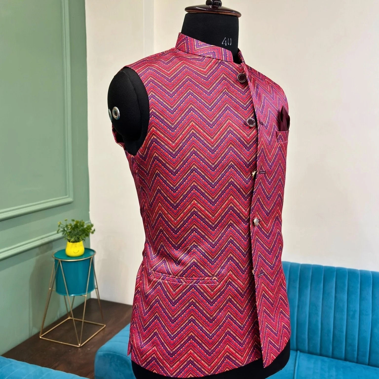 Make a striking entrance with the Cultural Fusion Printed Nehru/Modi Jacket — an elegant hip-length jacket designed for festive occasions and weddings. This piece features bold all-over ethnic prints, a mandarin (stand) collar, and clean button-front closure. Crafted for modern ethnic wear, it layers effortlessly over kurtas or shirts to create a refined, stylish look.