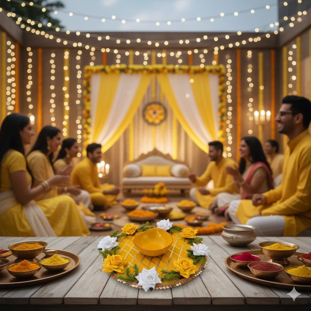 • ELEGANT DESIGN: Beautiful haldi ceremony platter featuring a sophisticated gold lattice pattern and adorned with alternating yellow and white roses for a stunning presentation