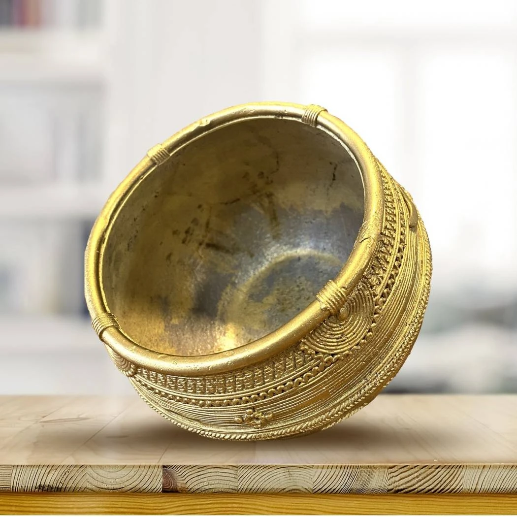 Bring home the rustic elegance of traditional Dhokra Tribal Art with this beautifully handcrafted Brass Mana Bowl. Symbolizing heritage craftsmanship, this decorative vessel is made using the ancient lost-wax casting technique, giving it rich texture and intricate tribal motifs.