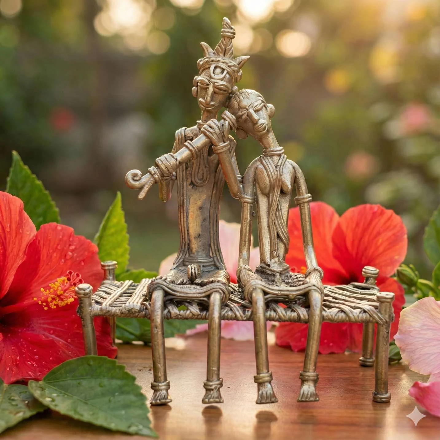 The artwork sits gracefully on a handcrafted cot-like base, adding rustic authenticity to its overall appearance. Ideal for your living room, pooja room, office table, or gift collection, this Dhokra showpiece symbolizes love, harmony, and divine connection.