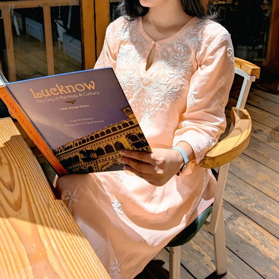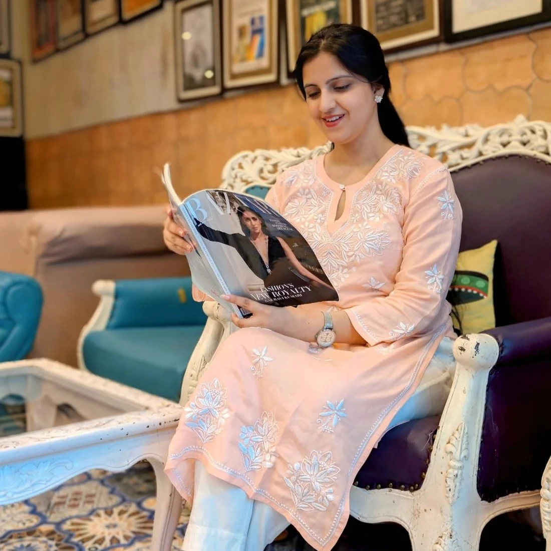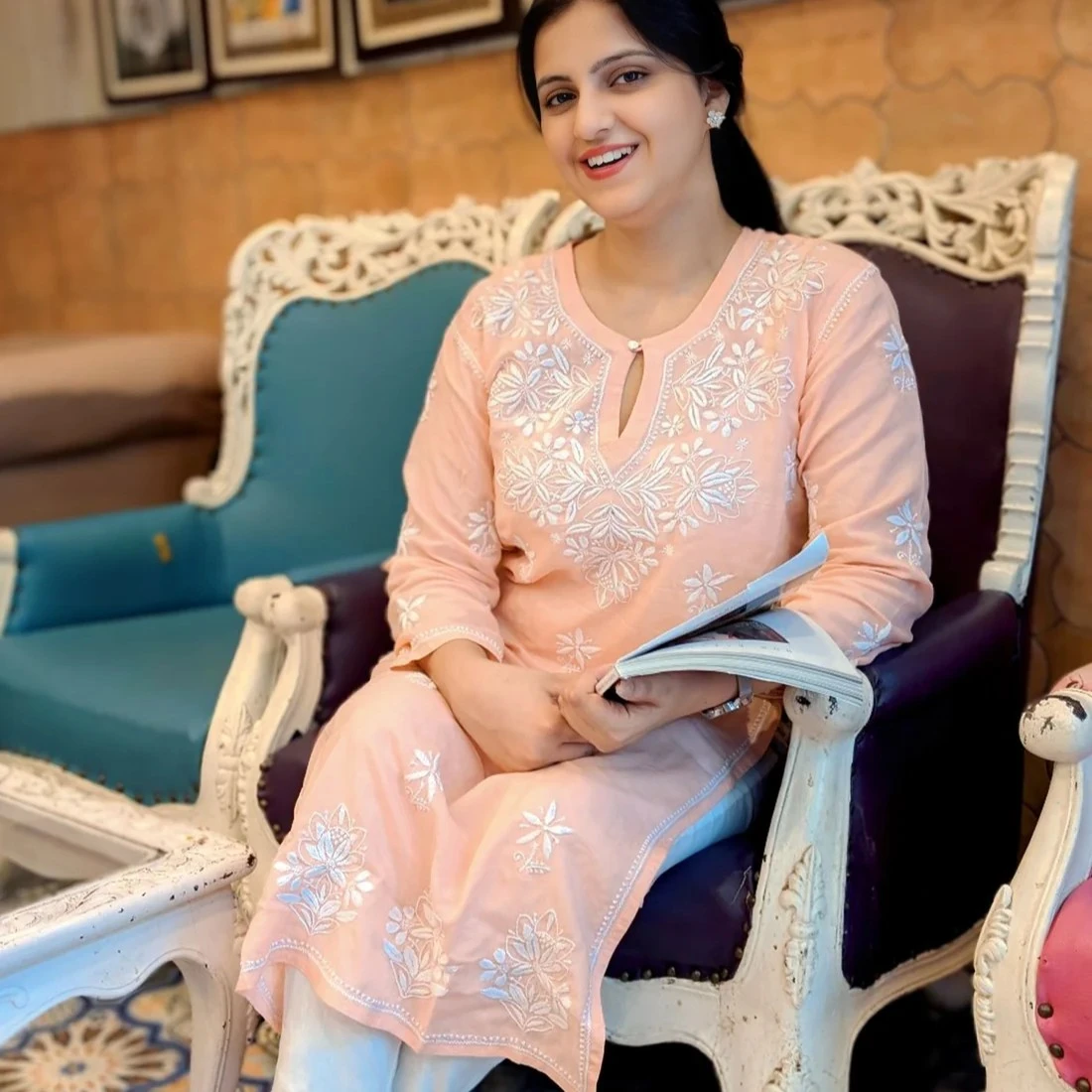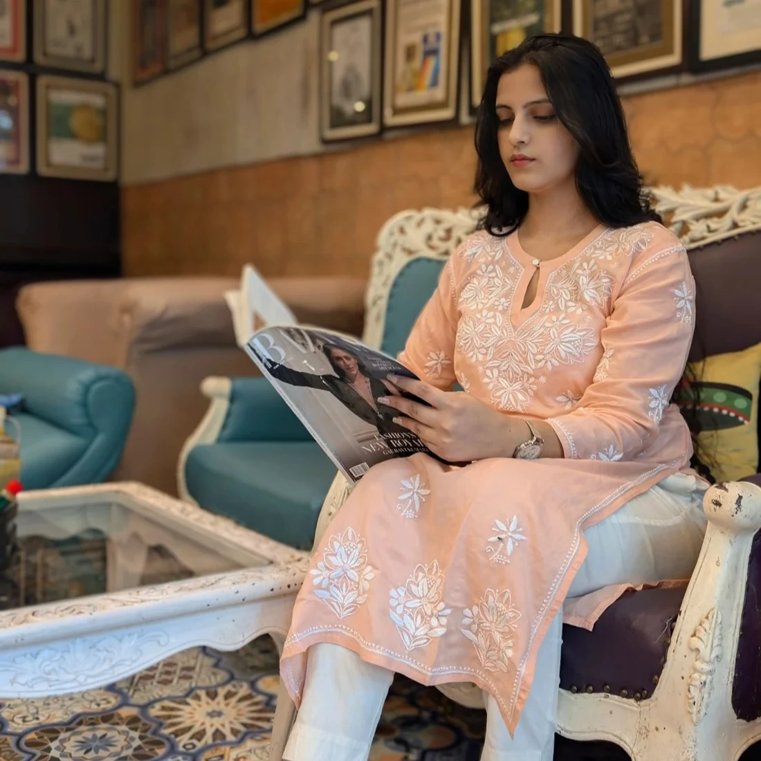 This kurta blends timeless chikankari artistry with the luxurious comfort of modal cotton. Light, breathable, and beautifully embroidered, it is ideal for long hours while maintaining a sophisticated ethnic look.