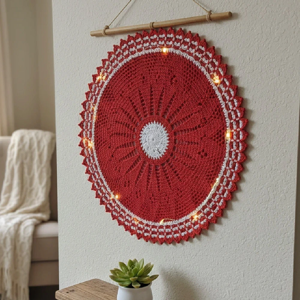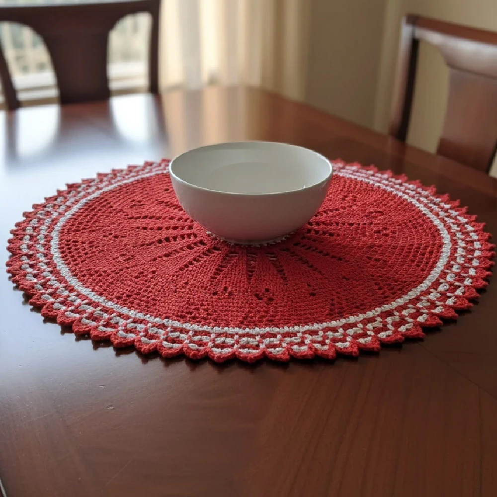 Design Aesthetics: Features a bold, highly contrasted pattern. The core is a radiant red field with radial openwork spokes, suggesting a spinning wheel or starburst. A crisp white ring frames the center, and the edge is finished with a delicate white scallop pattern.