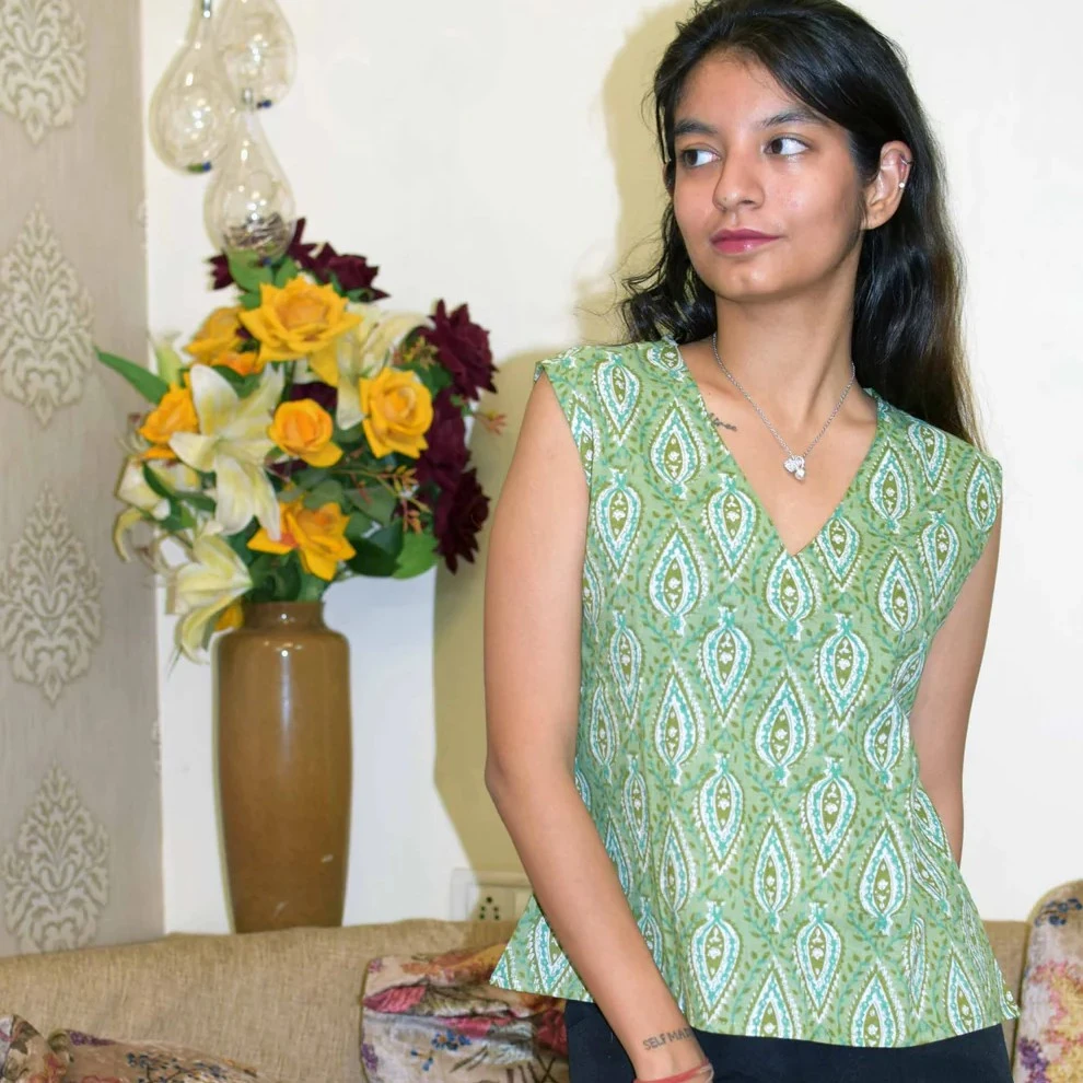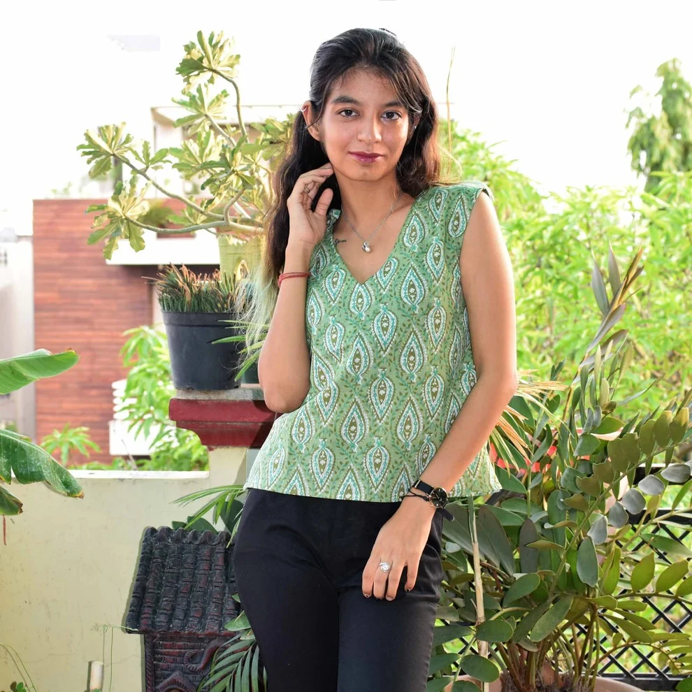 Features a V-neckline and sleeveless (short top) design for a modern and chic silhouette.