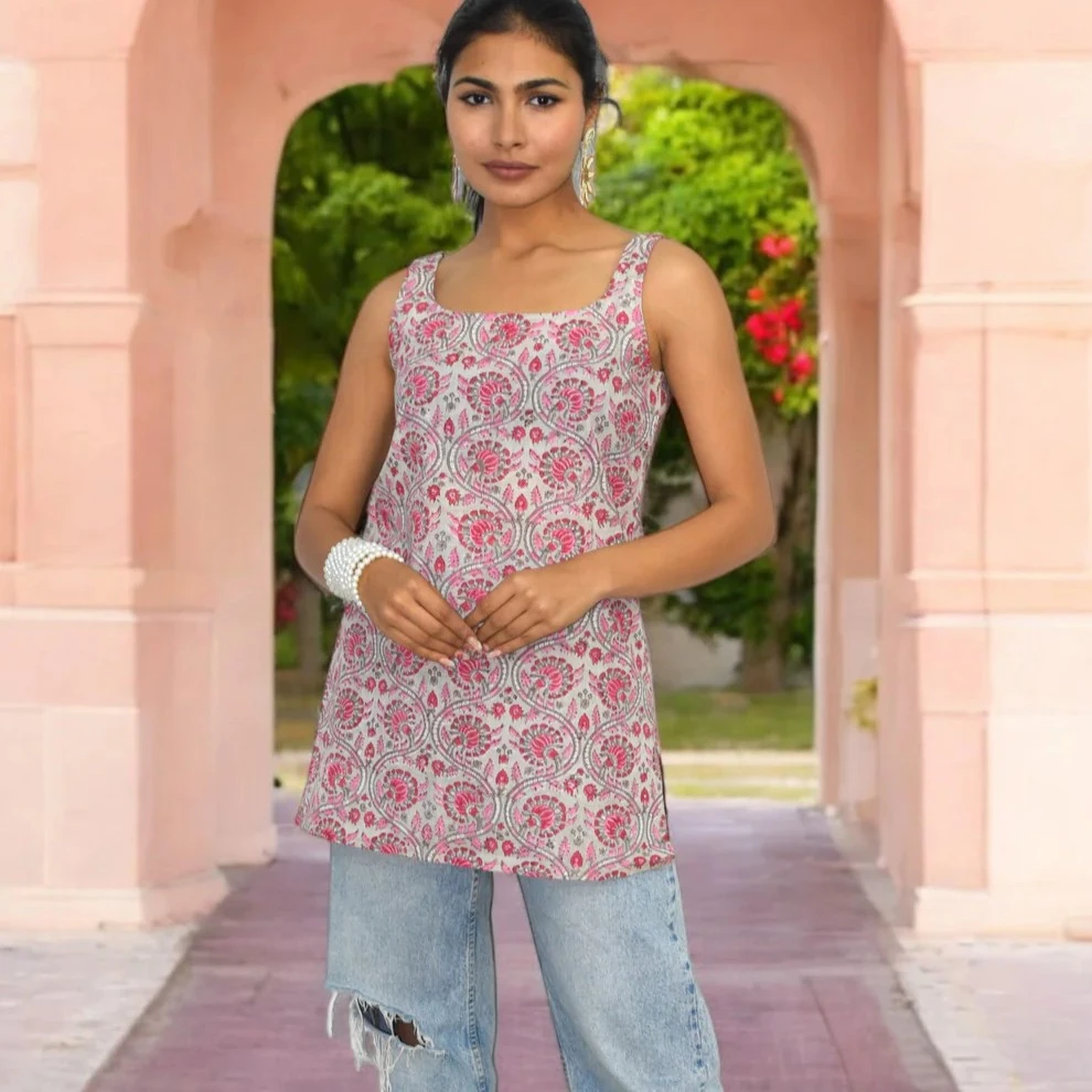 Embrace timeless elegance with the Grey-Pink Booti Cotton Broad Neck Kurti, a perfect blend of traditional craftsmanship and contemporary design. Made from 100% pure cotton, this kurti features a subtle grey base adorned with delicate pink booti prints, showcasing the rich heritage of Jaipur's hand block printing. The broad neck design and sleeveless cut ensure comfort and style, making it suitable for various occasions.