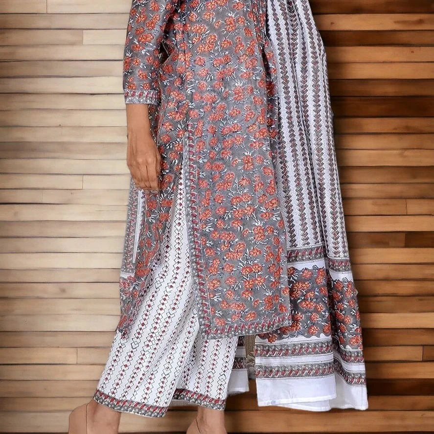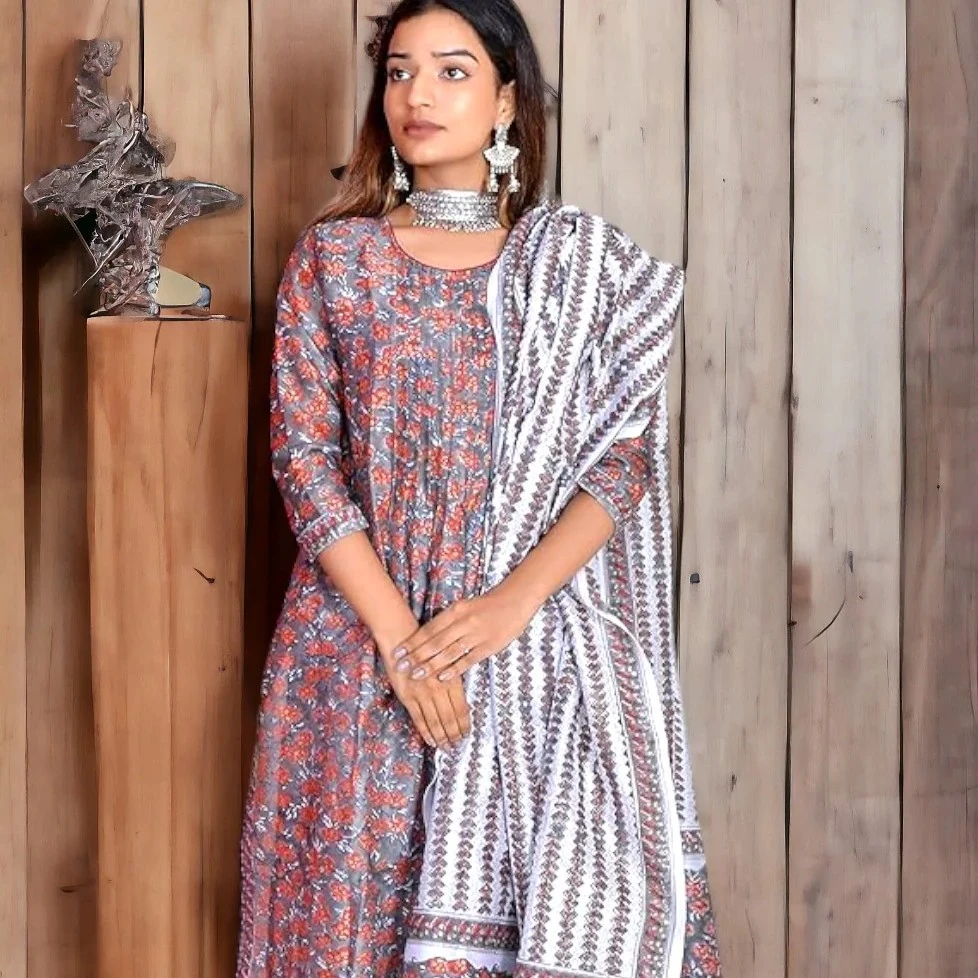Includes a fully-stitched kurta/top (approx. 44″ length) with three-quarter sleeves and matching bottoms plus a coordinated Chanderi dupatta.
