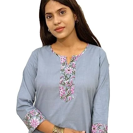 Add a touch of traditional elegance to your wardrobe with the Grey Short Kurti Top. Crafted from 100% pure cotton, this kurti features an elegant grey base adorned with intricate pink bottle motifs, hand block printed using Sanganeri and Bagru techniques. The unique neck design and 3/4 sleeves add a modern twist to the classic silhouette.