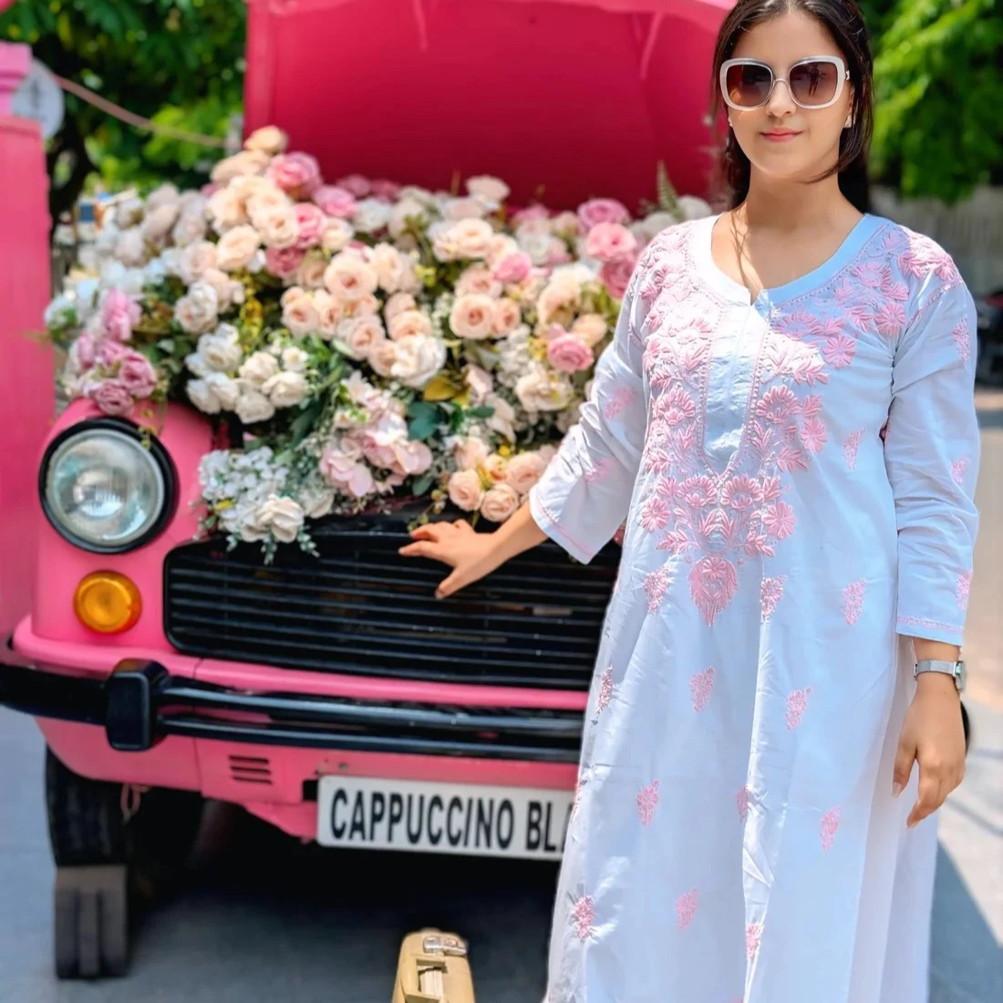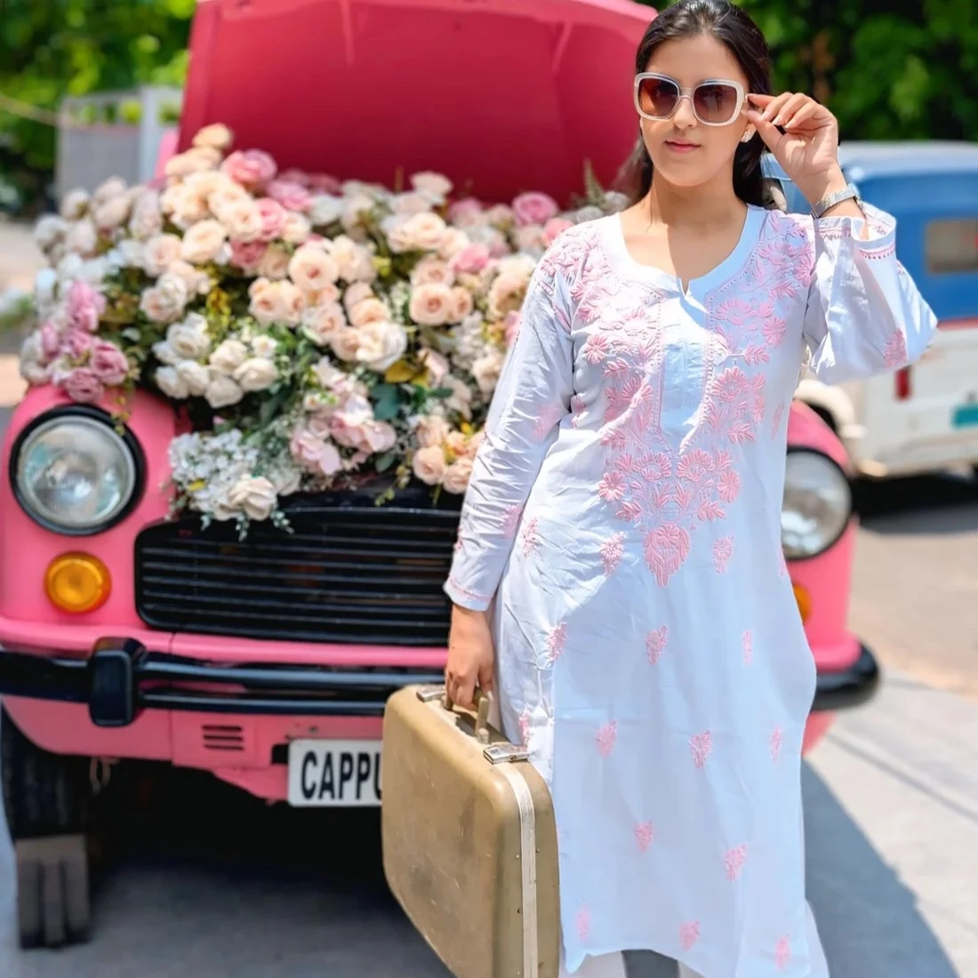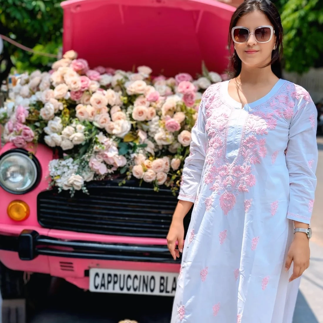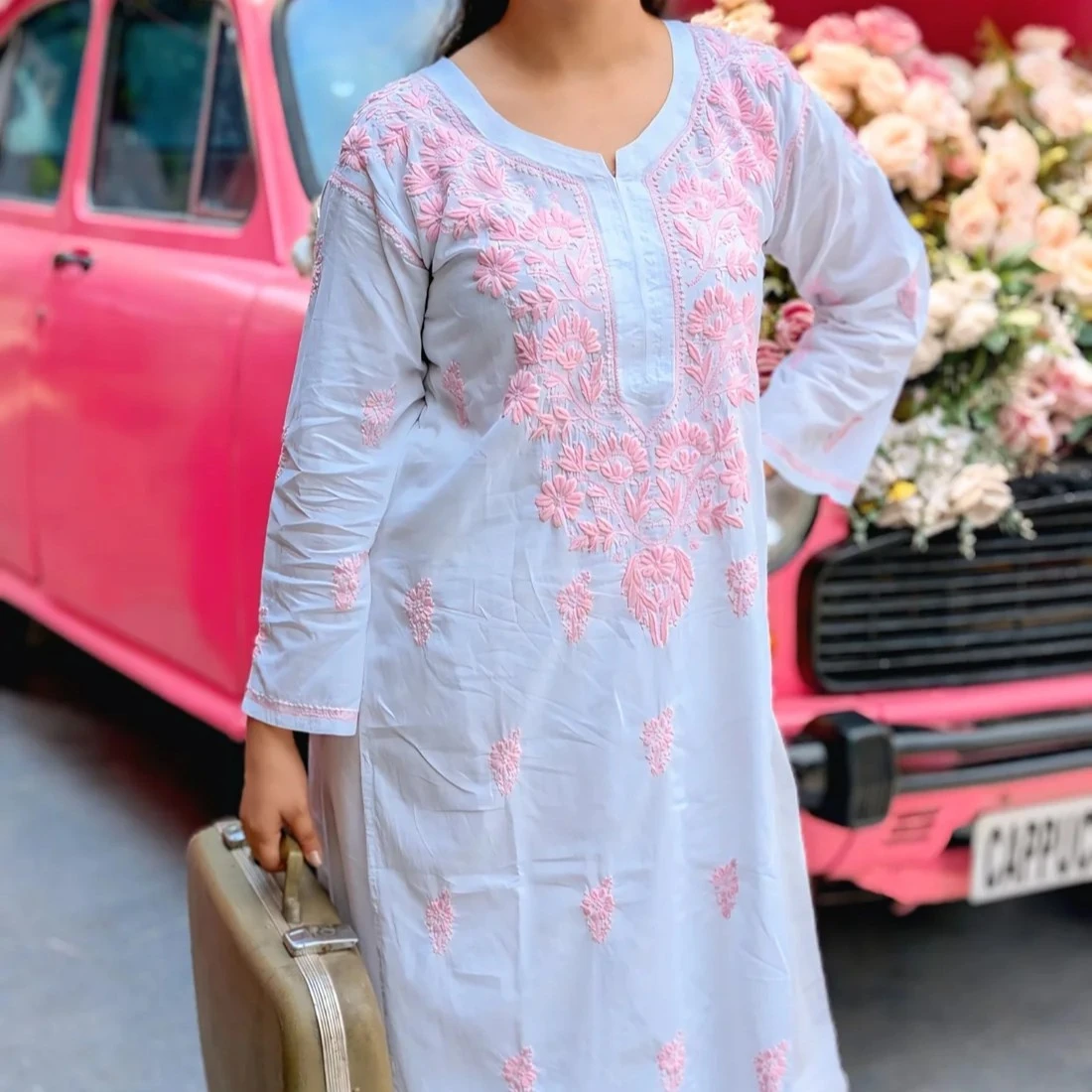 Gracefully designed with delicate chikankari embroidery on soft mulmul cotton, the Gulabi-Noor kurta blends traditional elegance with breathable comfort. Its straight cut and 3/4 sleeves make it an ideal choice for workwear and festive occasions.