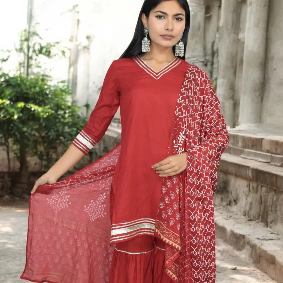 Sleeveless kurta/top paired with a flared sharara bottom and a matching lightweight printed dupatta—complete coordinated look.