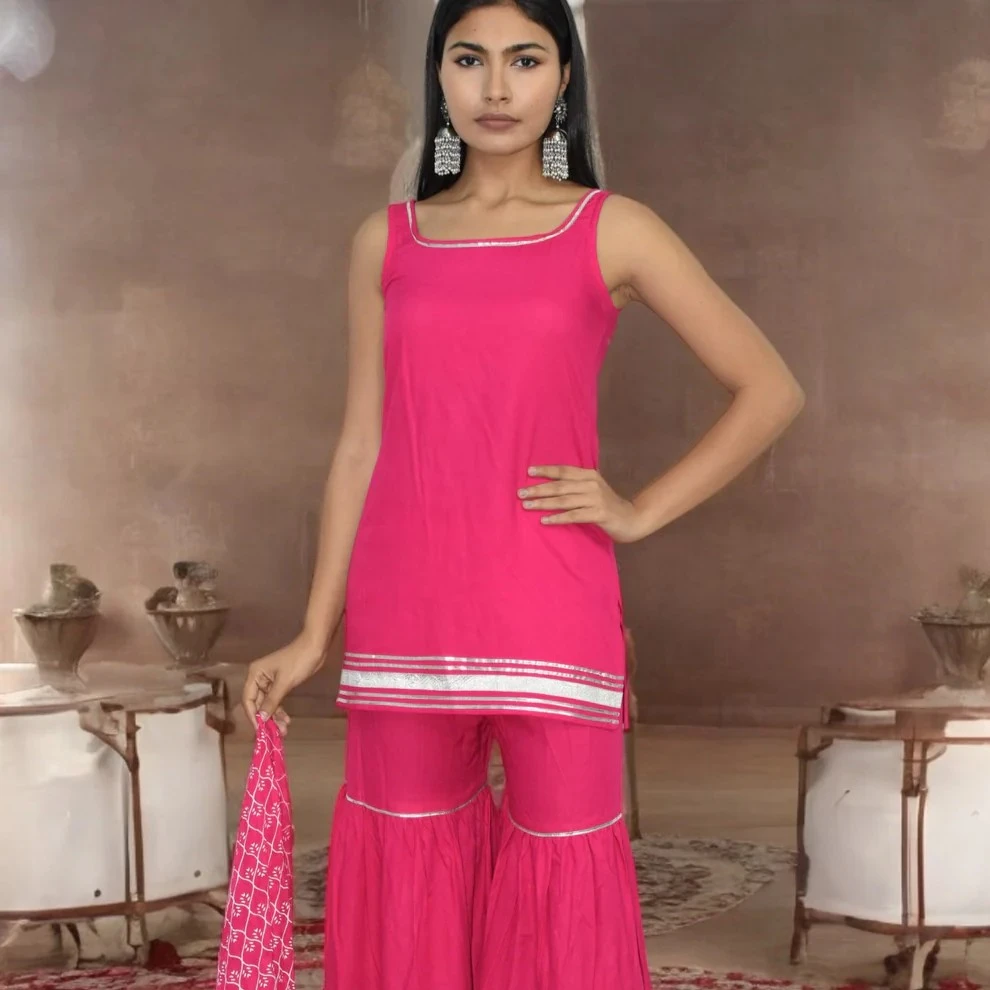 Set includes a sleeveless kurta/top, tiered sharara bottom and a matching lightweight dupatta—offering a complete, coordinated ethnic look.