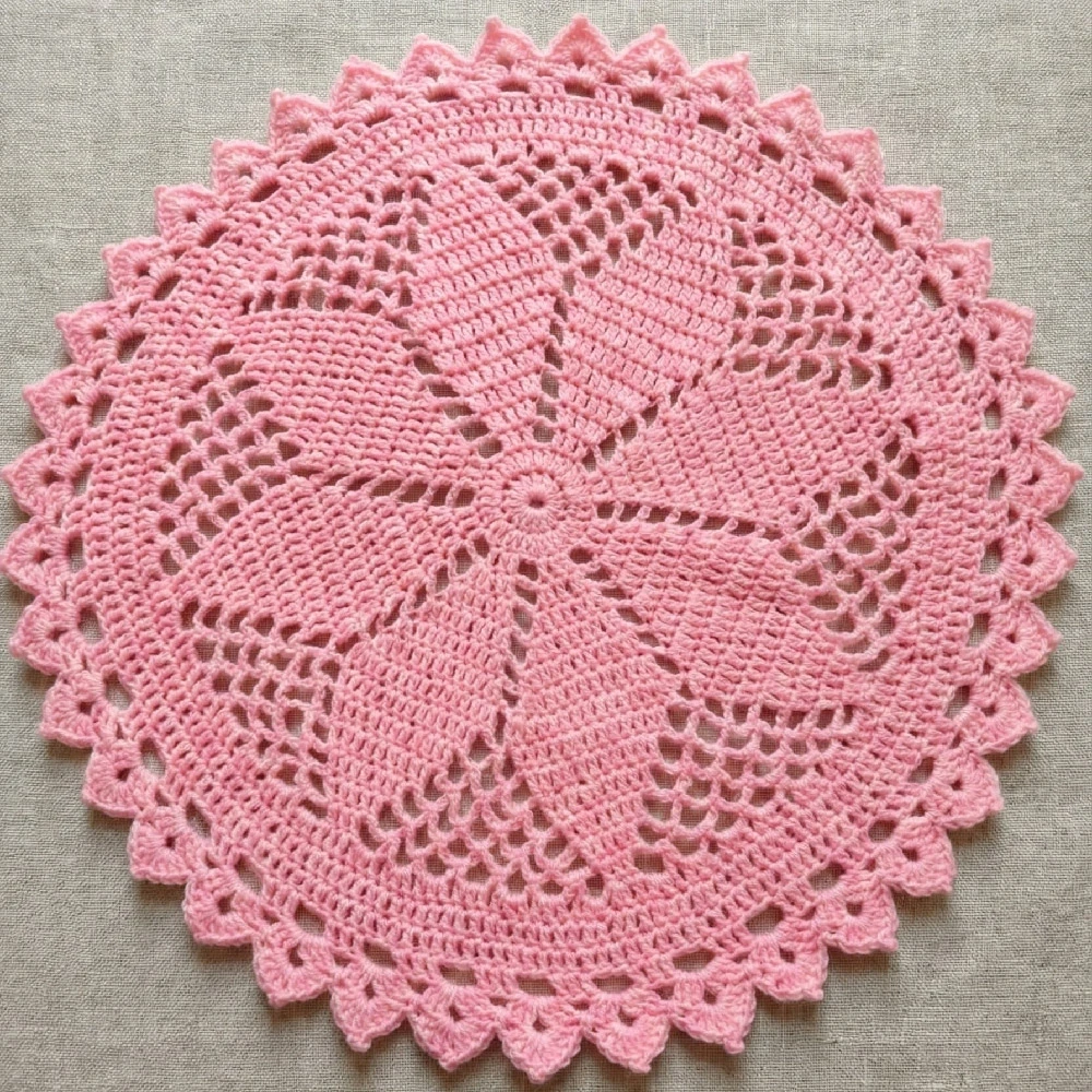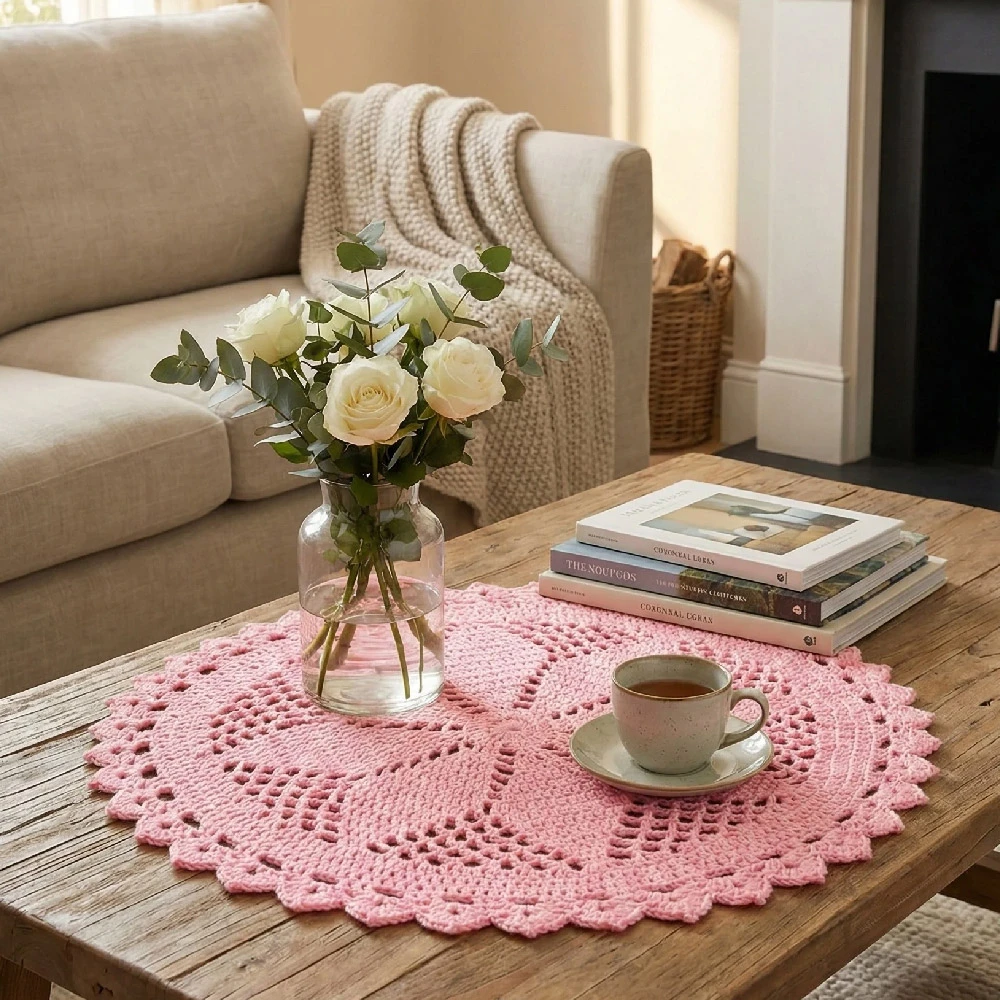 Design Aesthetics: Features a central floral mandala motif that expands into delicate openwork lacework. The perimeter is finished with a detailed scalloped (picot) edging, providing a polished and elegant silhouette.