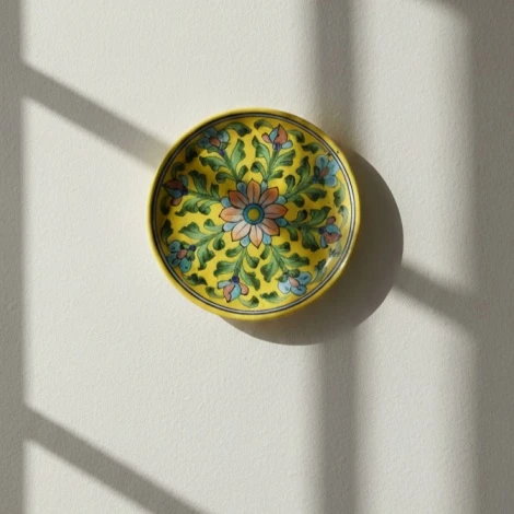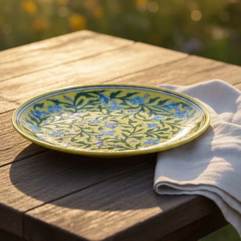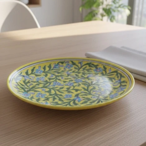 Bring a splash of vibrant elegance to your home with this handcrafted Blue Pottery decorative plate, featuring a radiant yellow base adorned with green vines and delicate blue flowers. A true example of traditional Jaipur blue pottery, this plate is meticulously handmade and hand-painted by skilled artisans using age-old techniques.