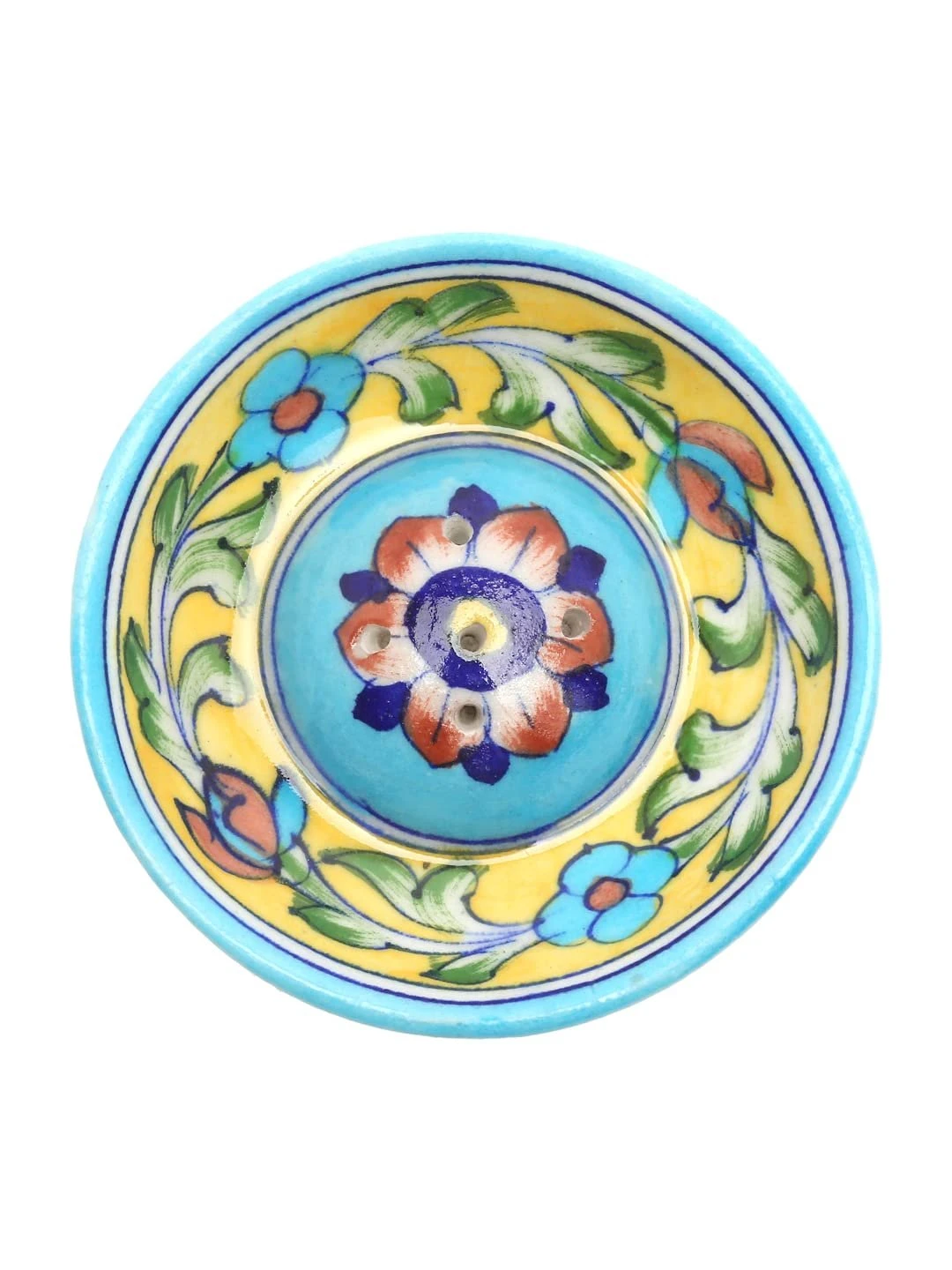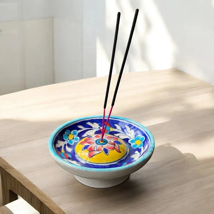 Carefully handmade by skilled artisans using the renowned Jaipur Blue Pottery technique, each piece is a symbol of craftsmanship and cultural heritage. The dome-shaped center ensures the incense stick stays upright, while the base collects ash neatly.