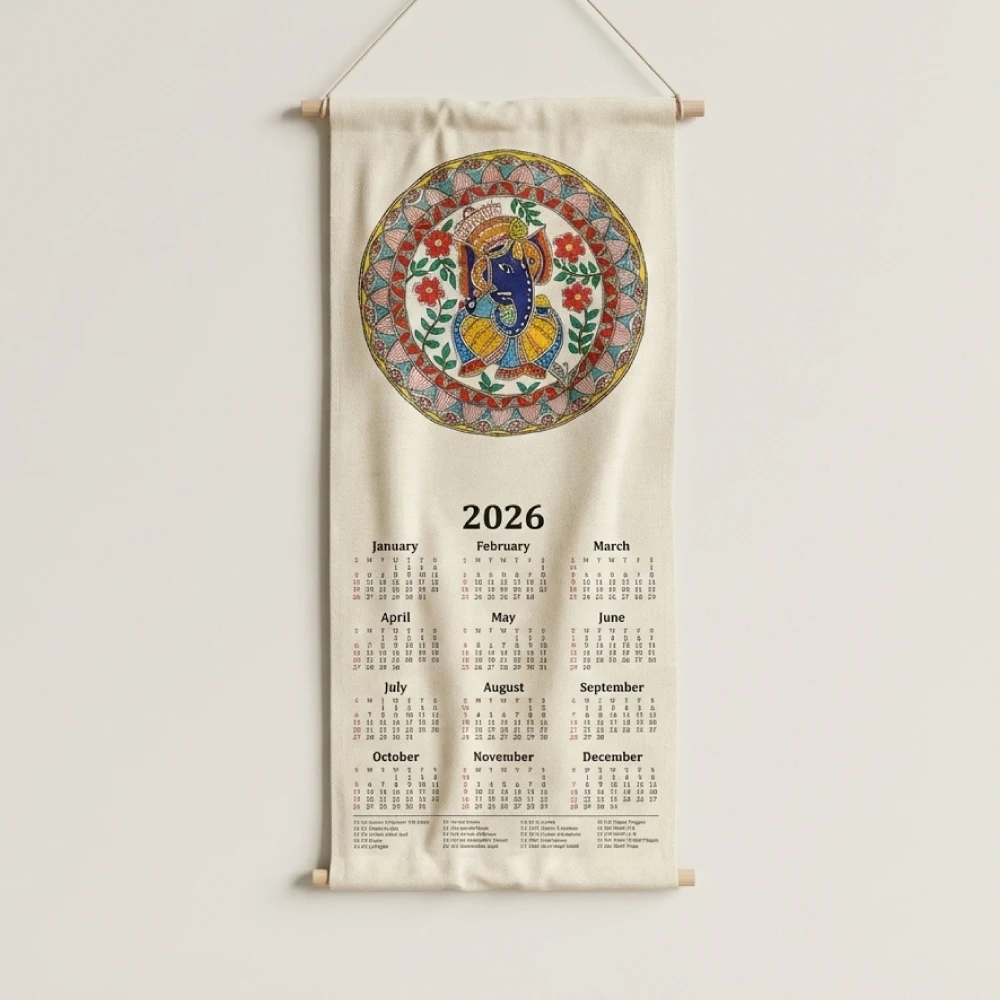 Welcome positivity and auspicious beginnings with this Handcrafted Fabric Wall Calendar 2026 – Circular Ganesh Folk Art Design.