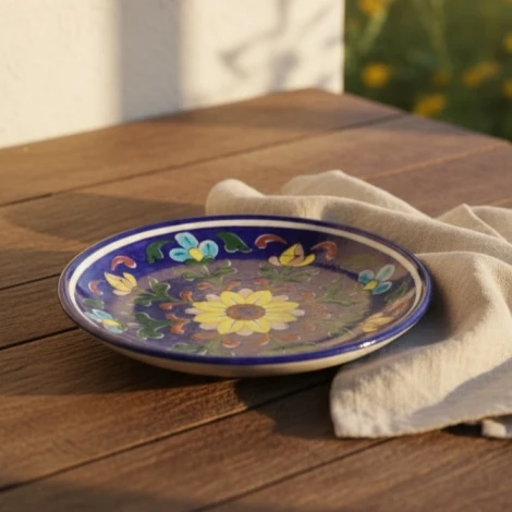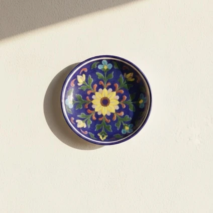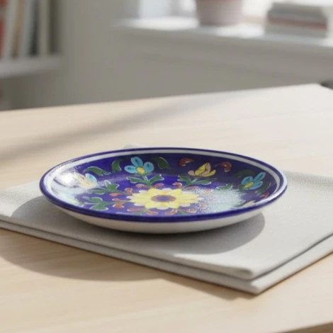 Bring timeless charm to your home with this exquisite handcrafted Jaipur Blue Pottery plate featuring a beautiful floral pattern. The bold yellow and blue flowers intricately painted over a rich royal blue base make this ceramic plate a stunning piece of art. Perfect for wall décor, tabletop decoration, or as a thoughtful ethnic gift, this plate is made using traditional Jaipur blue pottery techniques—eco-friendly, lead-free, and completely handmade by local artisans.