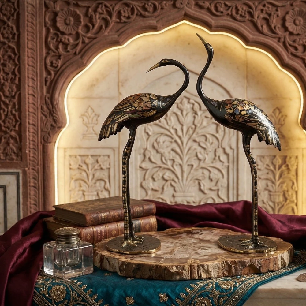 Made by skilled artisans from Moradabad—India’s renowned hub for brass and metal handicrafts—this crane pair reflects the richness of Indian craftsmanship and adds a sophisticated touch to any décor setting.