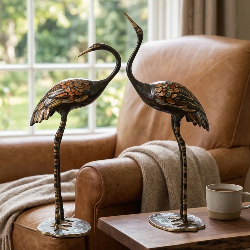 This elegant crane sculpture set features intricate handcrafted detailing and an antique finish that gives it a timeless artistic appeal. The pair design creates a balanced decorative display, perfect for center tables, office desks, shelves, or display cabinets.