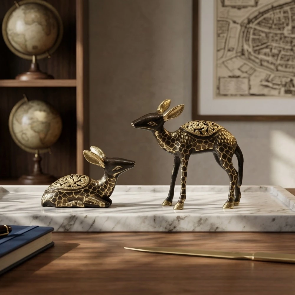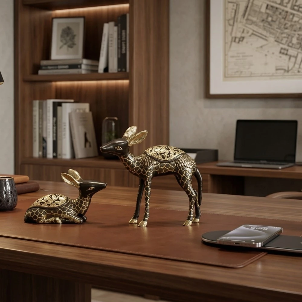 This decorative pair features intricate handcrafted patterns with a beautiful antique metal finish. The combination of a standing and sitting deer creates a balanced and visually appealing display, perfect for tables, shelves, office desks, or display cabinets.