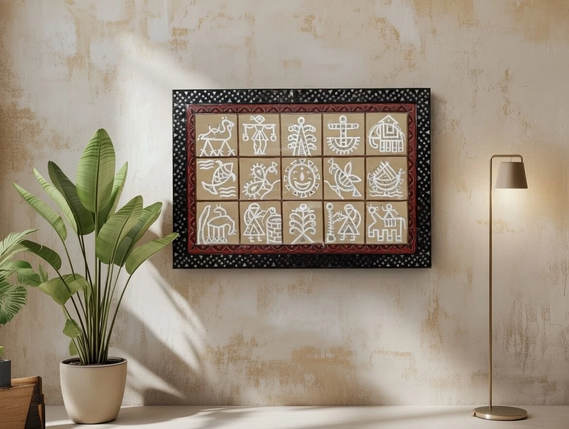 Celebrate the richness of Indian folk heritage with this handcrafted Lippan Art wall panel, featuring a captivating grid of traditional tribal and symbolic motifs. Created using the age-old mud relief technique and hand-painted detailing, the artwork showcases stylized figures, animals, nature symbols, and ritual icons inspired by rural Indian culture.