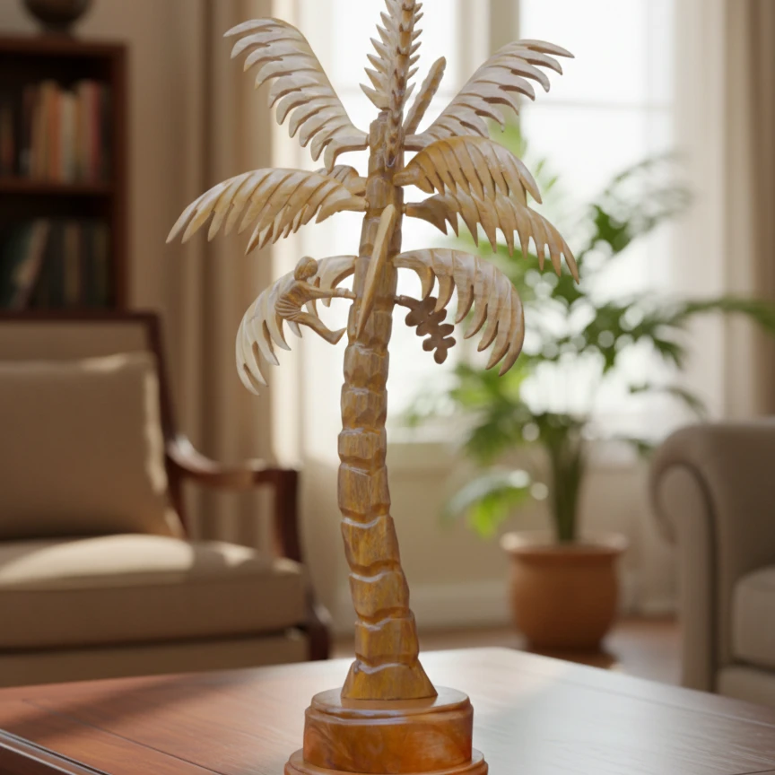 Enhance your living space with the natural charm of this Handcrafted Wooden Coconut Tree Showpiece. Expertly carved by skilled artisans, this elegant décor piece reflects fine craftsmanship through its detailed trunk, layered palm leaves, and sturdy base.