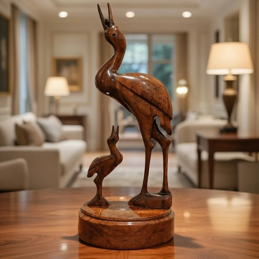 Bring a touch of nature and elegance to your space with this Handcrafted Wooden Heron Showpiece, beautifully carved by skilled artisans. Featuring an upward-raised head posture and a charming mother–baby heron composition, this décor piece symbolizes care, grace, and harmony. Finished in a rich natural brown polish, it highlights the wood grain and adds warmth to any table, shelf, or rack décor setting.