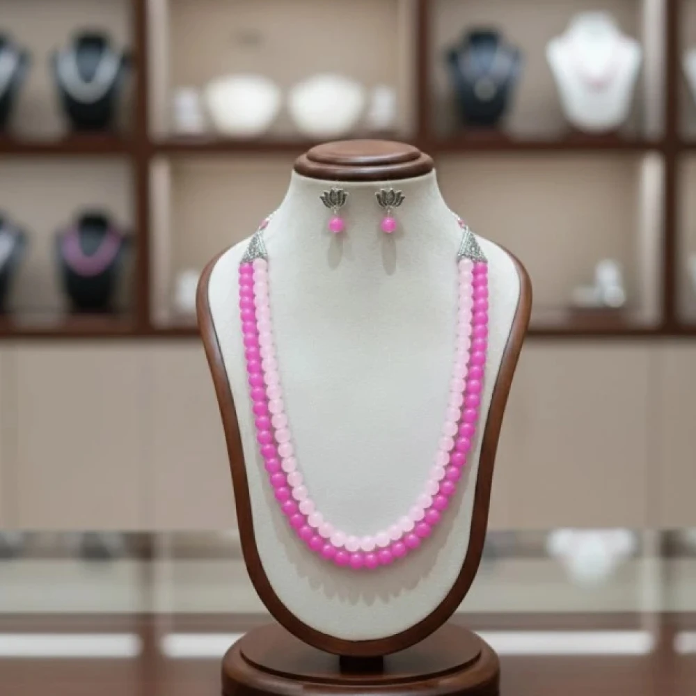 Elevate your ethnic and contemporary wardrobe with this exquisitely handcrafted pink beaded jewellery set. Designed for the modern woman who values both style and comfort, this set features vibrant pink beads meticulously strung into a premium double-layer necklace with matching lotus-inspired earrings.