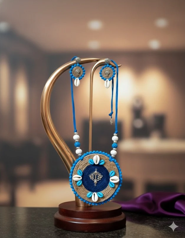 Apne ethnic wardrobe ko ek naya aur artistic touch dijiye is khoobsurat Handmade Jute aur Cowrie Shell (Kaudi) Necklace Set ke saath. Yeh piece traditional craftsmanship aur modern bohemian style ka ek perfect blend hai.
