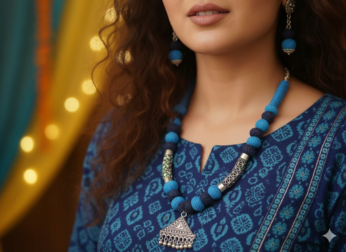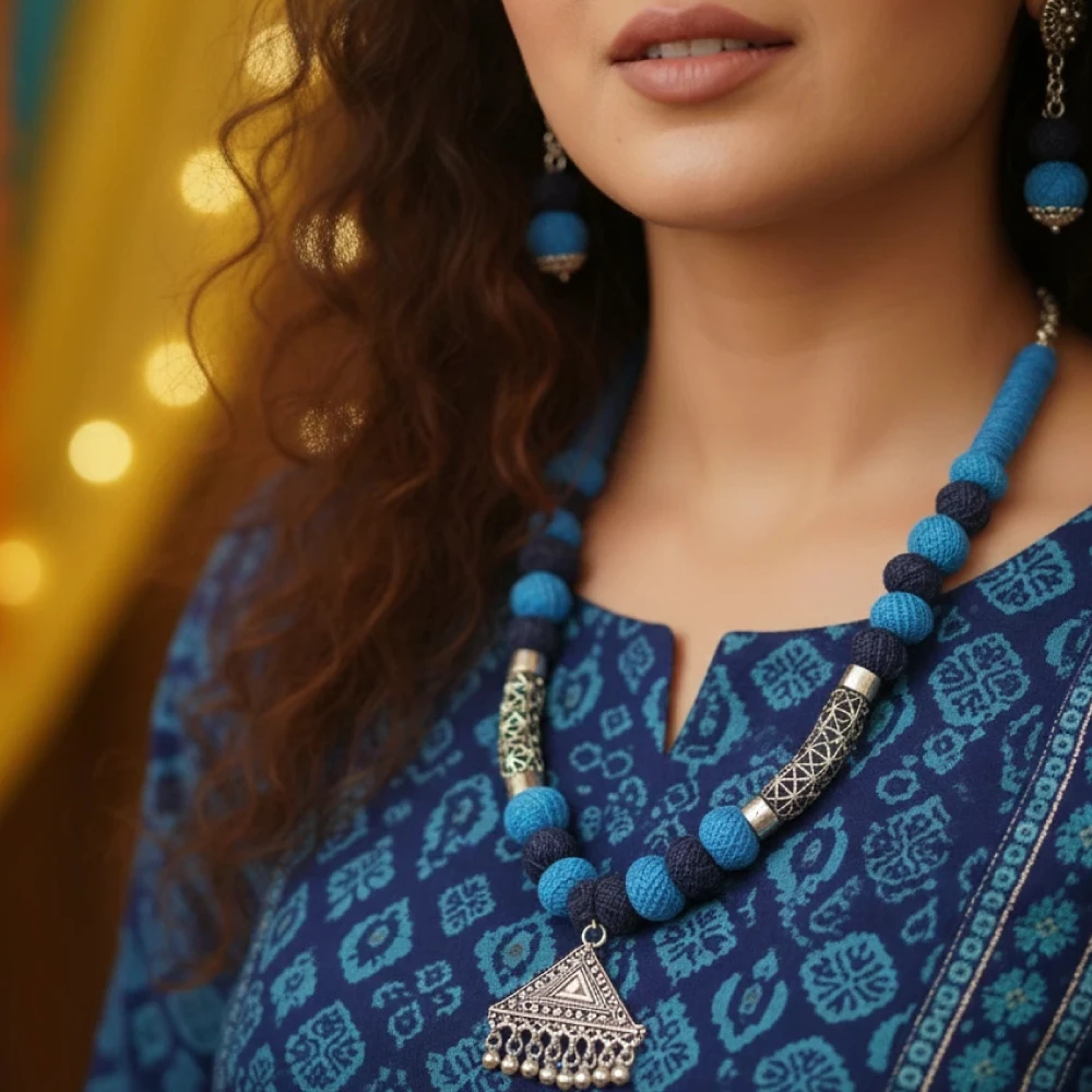 Body: Experience the timeless elegance of traditional Indian craftsmanship with this exquisite necklace and earring set. Each piece is meticulously handmade, featuring striking blue beads interwoven with a detailed oxidized silver-look pendant and accents. The rich, deep blue color is both vibrant and versatile, making it the perfect statement piece for any festive or cultural occasion.
