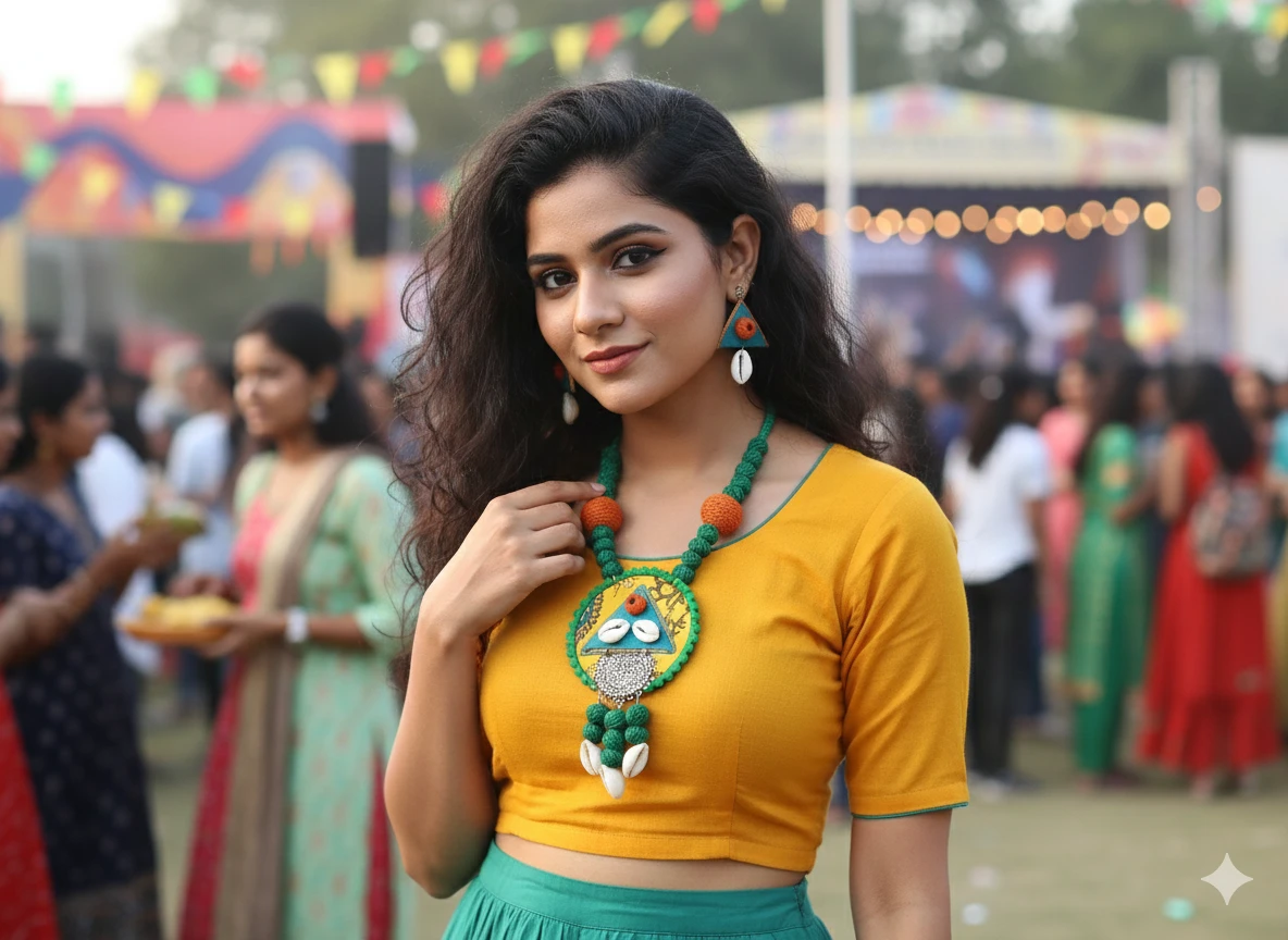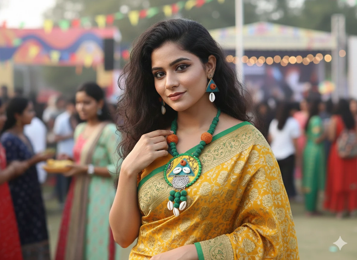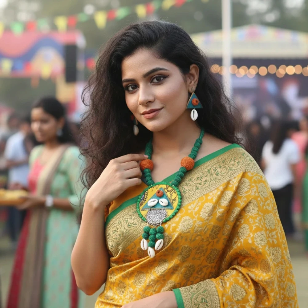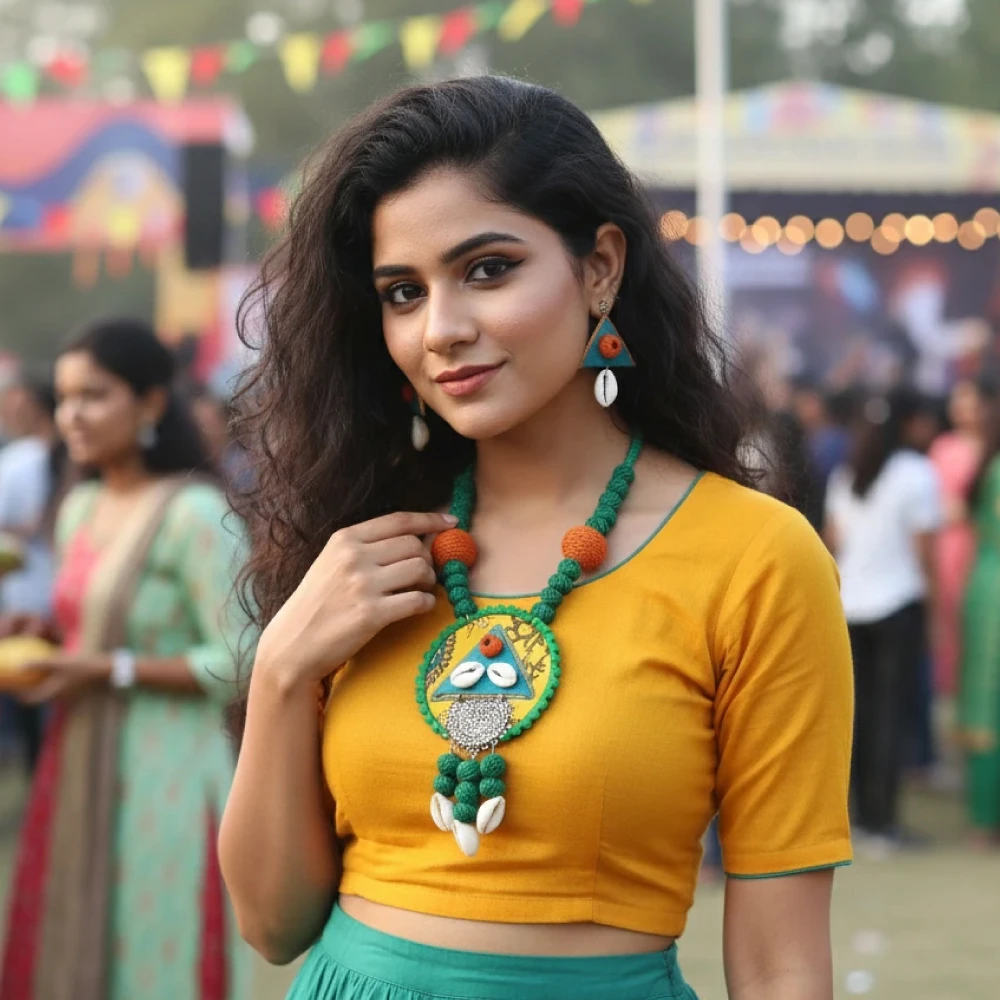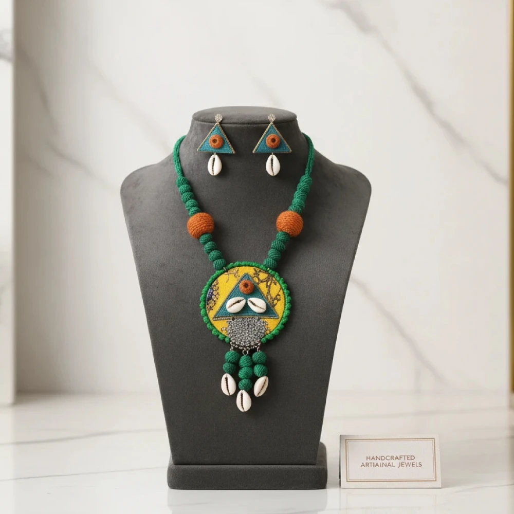 Step into the spotlight with this exquisitely handmade statement necklace and earring set. Designed for the modern woman who loves to blend traditional artistry with bohemian chic, this set is a celebration of vibrant color and natural elements.