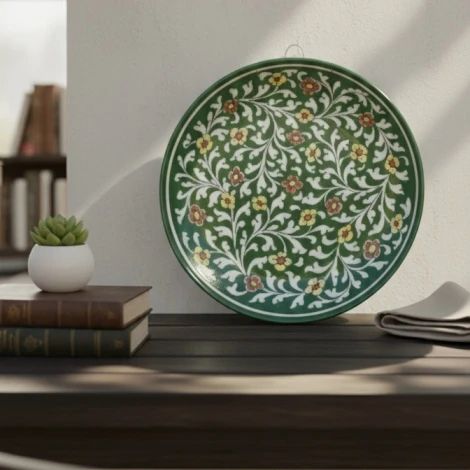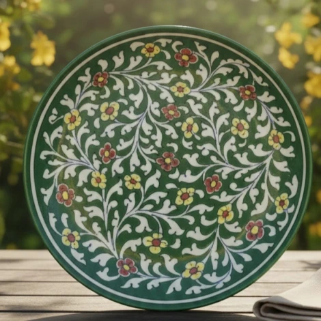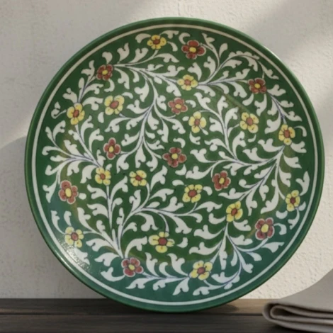 Celebrate the timeless beauty of Indian craftsmanship with this Handcrafted Blue Pottery Wall Plate featuring a lush green background and vibrant floral pattern. Intricately hand-painted with red and yellow blossoms intertwined with elegant white vines, this piece is a perfect example of Jaipur's traditional blue pottery artistry.