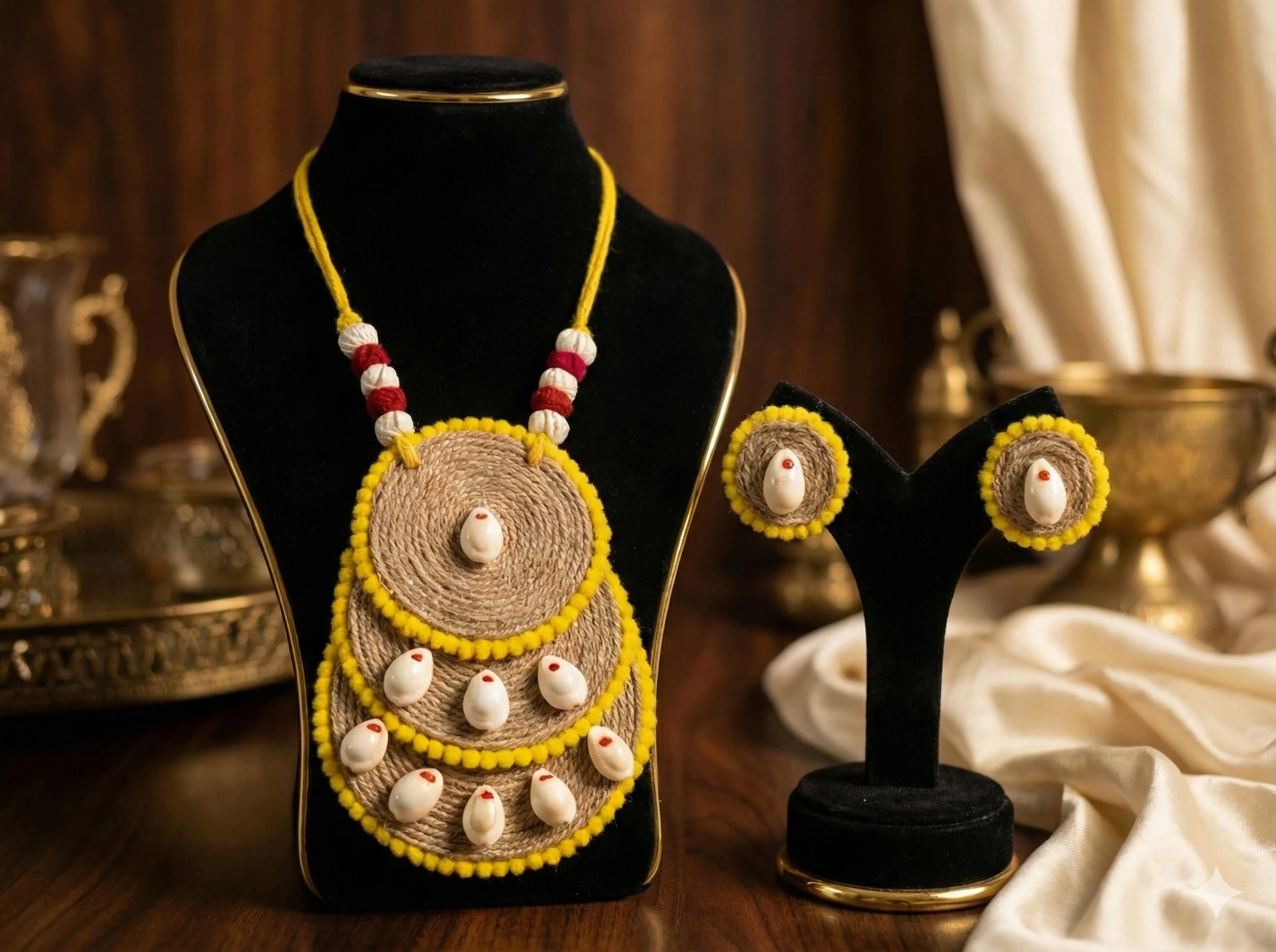 Embrace the beauty of raw materials with this exquisite Handcrafted Jute and Cowrie Shell Necklace Set. Expertly woven from natural jute twine, this set features a three-tier pendant design accentuated by a vibrant yellow threaded border. Each tier is adorned with natural white cowrie shells, adding a touch of coastal charm to the rustic base. The matching stud earrings complete the look, making this set a perfect accessory for cotton sarees, kurtas, or bohemian western wear.