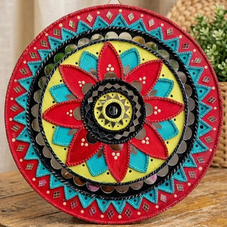 Celebrate colour, culture, and craftsmanship with this exquisite 12-inch handcrafted Lippan art wall décor. Created on a premium MDF base, this artwork reflects the soul of traditional Kutch folk art through intricate raised clay patterns, detailed mirror inlay, and rich hand-painted hues.