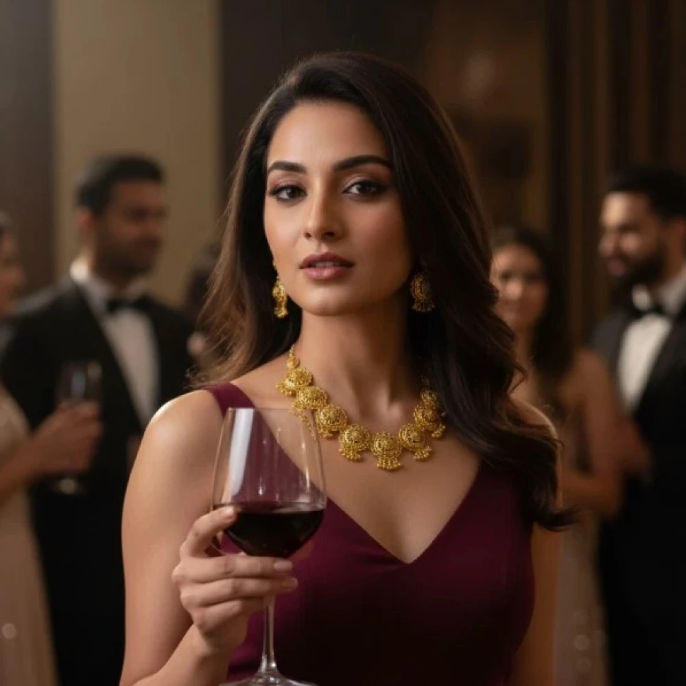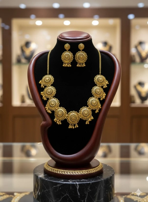 Style Tip: Pair this set with a dark-toned Kanjeevaram or Banarasi saree to let the golden hues truly pop.
