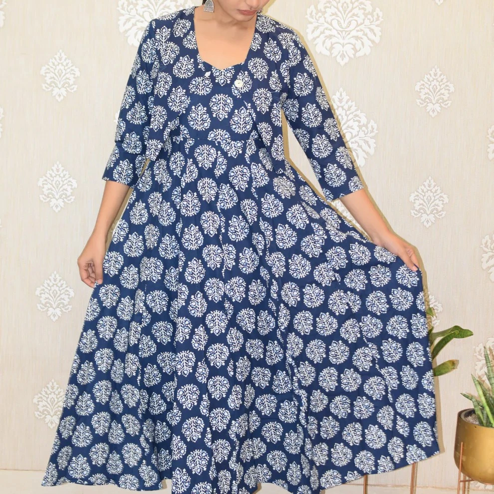 Features a rich indigo hue with “Amer Booti” (small floral motif) print design.