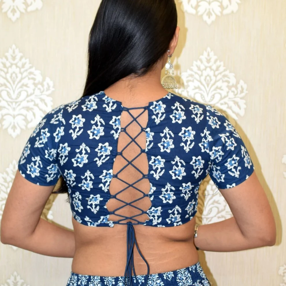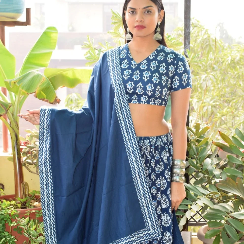 Deep indigo base colour embellished with small “booti” print motifs for subtle ethnic flair.