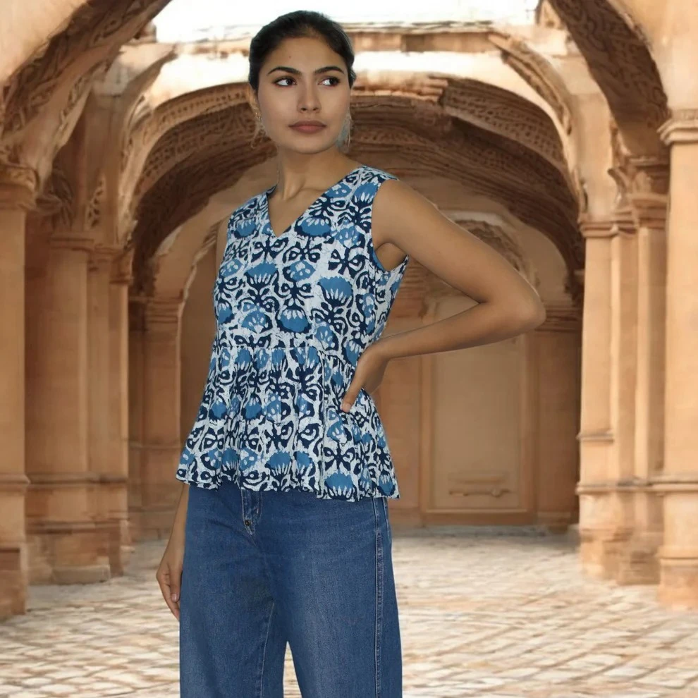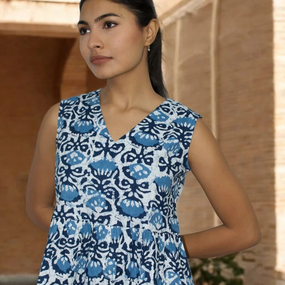 Features a rich indigo base with delicate white floral hand-prints.