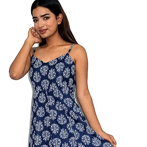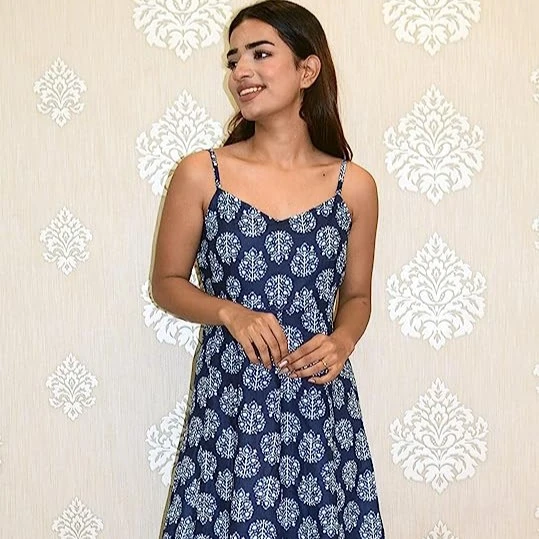 Elegant indigo colour base with a long flared silhouette for a graceful, flowing look.