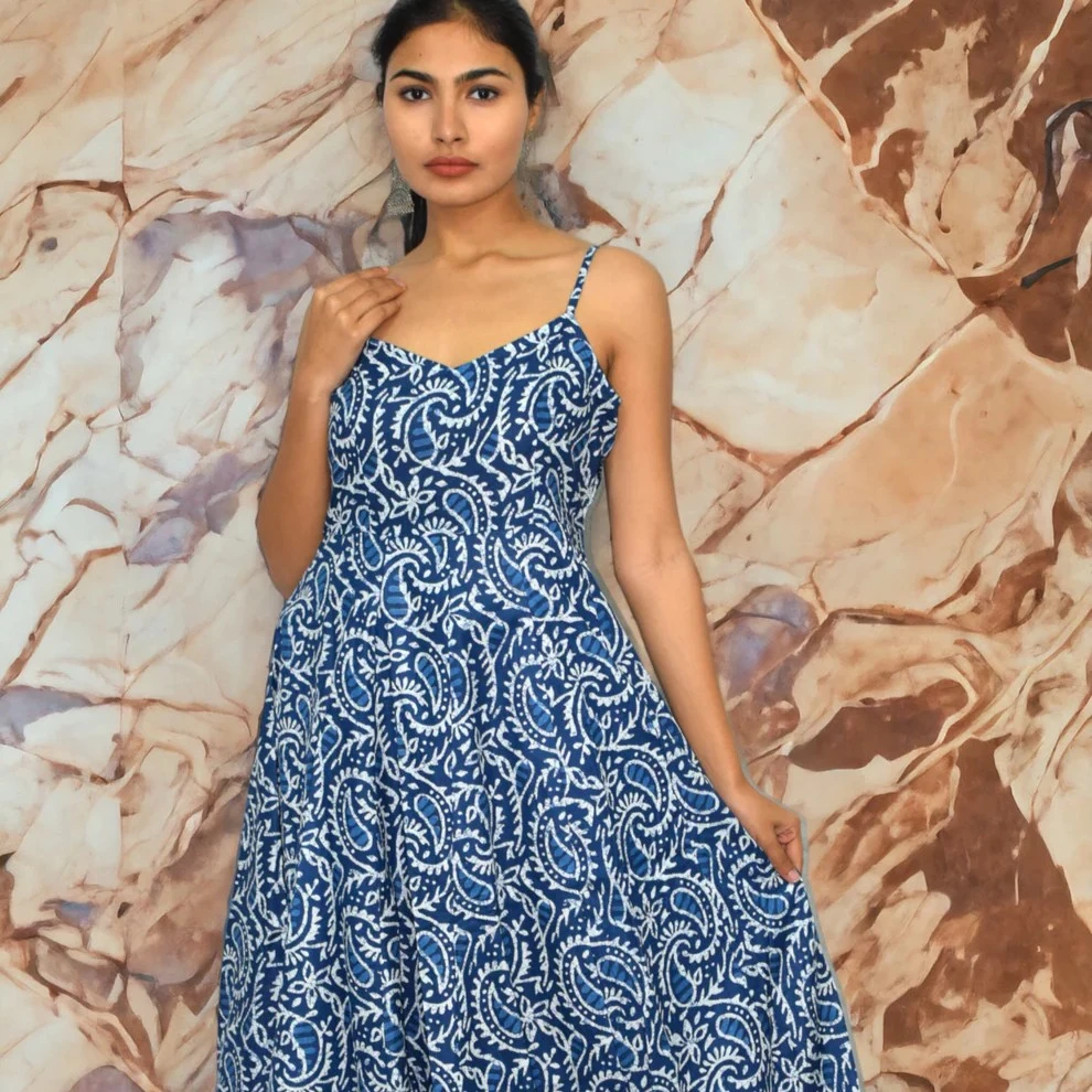 Deep indigo hue with a flared A-line silhouette for graceful movement.