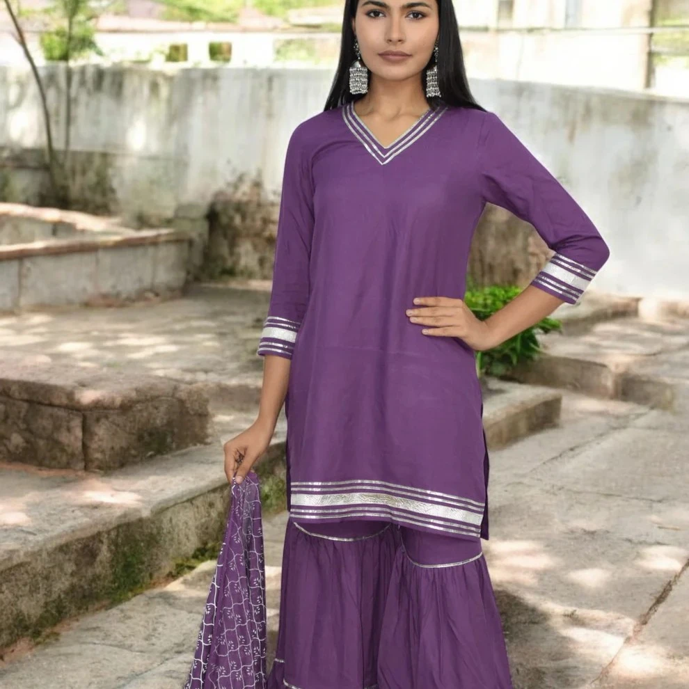 Set includes a kurta/top, flared sharara bottoms and a printed cotton dupatta for a complete ethnic look.