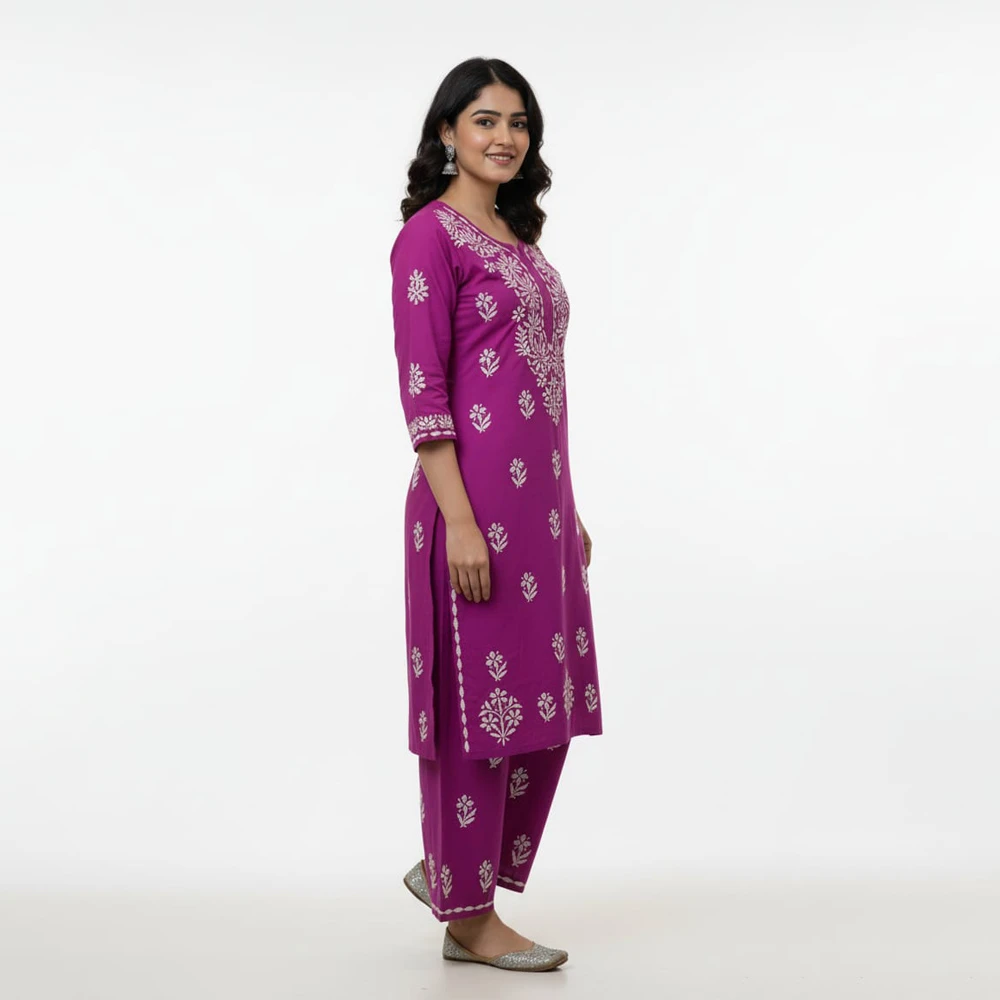 Step into elegance with this stunning Svamart Purple Lucknowi Chikankari Kurta Set, beautifully handcrafted by skilled artisans of Lucknow. The rich purple hue combined with intricate white floral thread embroidery creates a graceful and premium ethnic look—perfect for festive wear, office styling, and everyday elegance.