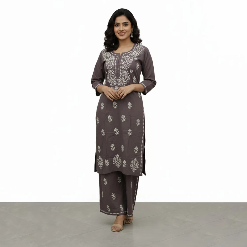Made from breathable cotton, the set offers comfort and sophistication. The matching embroidered palazzo completes the look with ease and style. The muted grey base paired with white embroidery creates a refined, graceful outfit—perfect for festive celebrations, office wear, family gatherings, or casual outings.