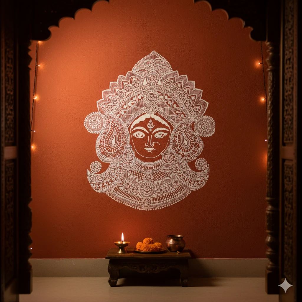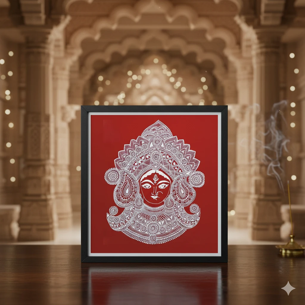 Goddess Durga Motif: Features the iconic and revered face of Goddess Durga, symbolizing strength, protection, and divinity.