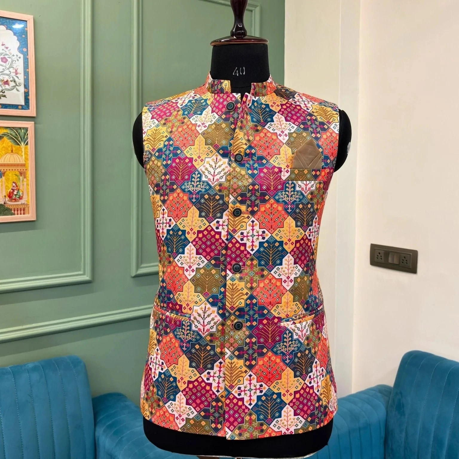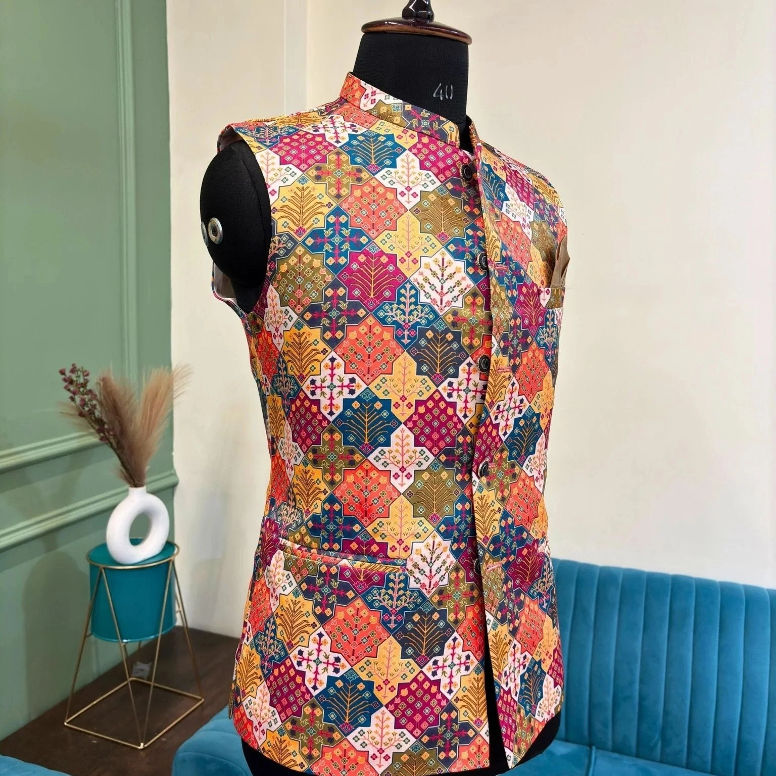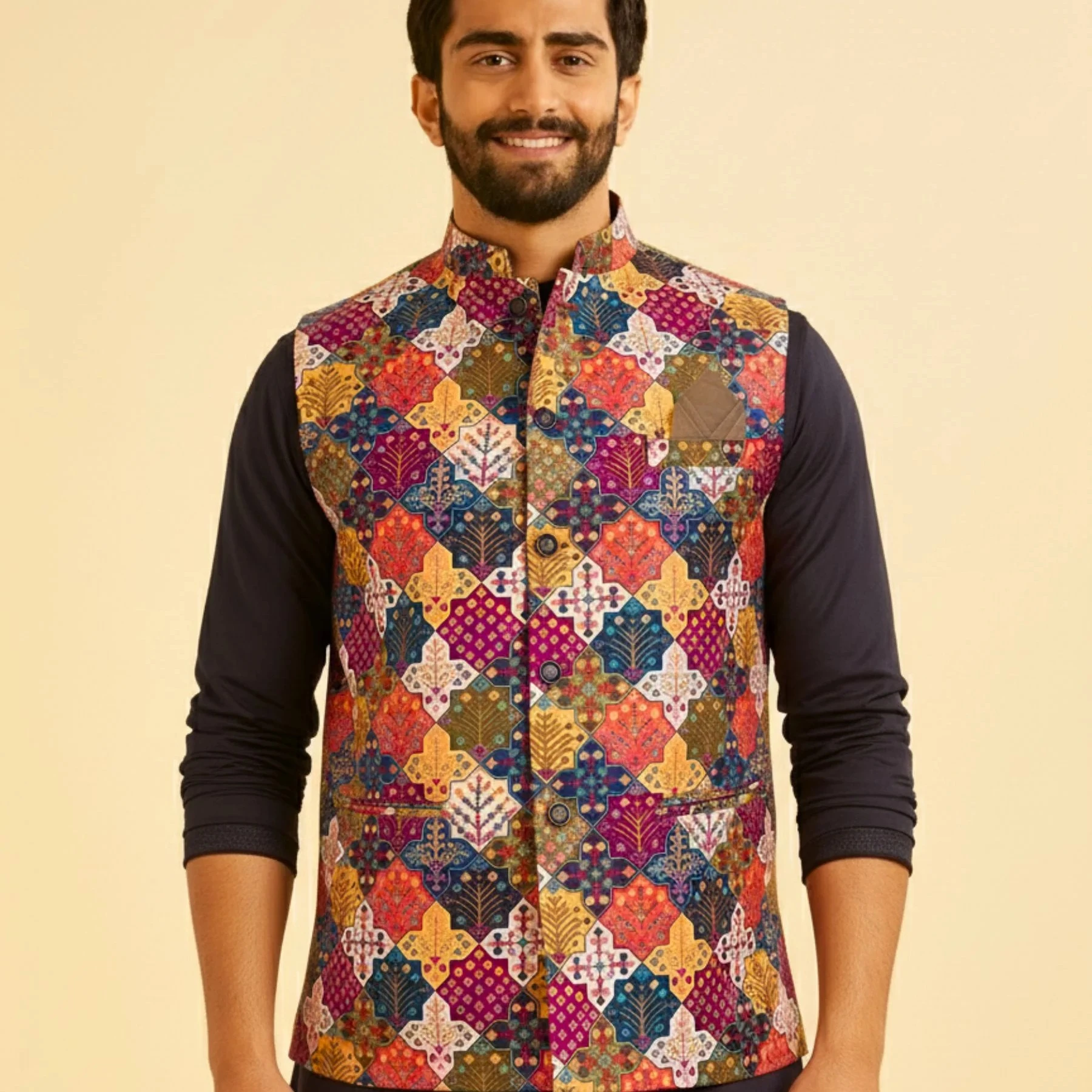 Make a stately impression with the Modern Elegance Jacket / Koti — a refined ethnic layer designed for weddings, festivals and special gatherings. Crafted with premium fabric, a hip-length cutoff and mandarin collar, this piece blends traditional design with modern flair. Whether paired over a kurta, sherwani or dress shirt and trousers, it brings structured elegance and timeless charm to your ensemble.