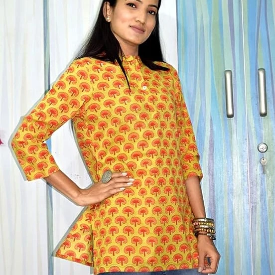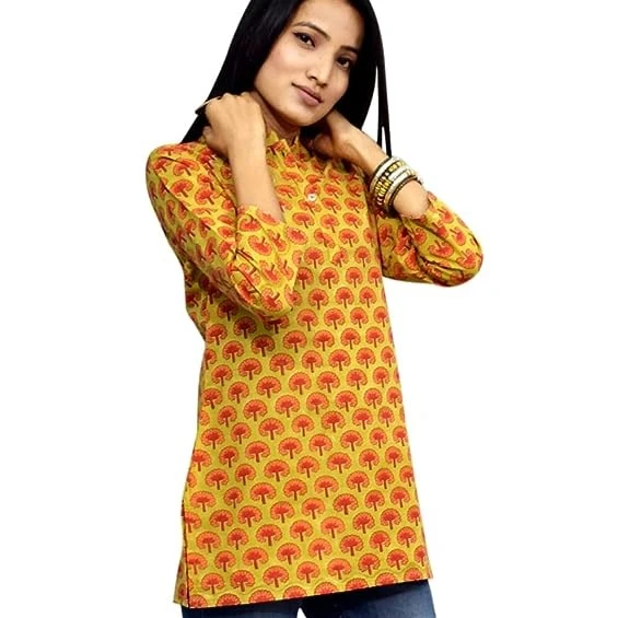 Add a touch of traditional elegance to your wardrobe with the Mustard Short Women Hand Print Kurti. Crafted from 100% pure cotton, this kurti features a vibrant mustard yellow base adorned with intricate hand block prints using Sanganeri and Bagru techniques. The unique neck design and 3/4 sleeves add a modern twist to the classic silhouette.